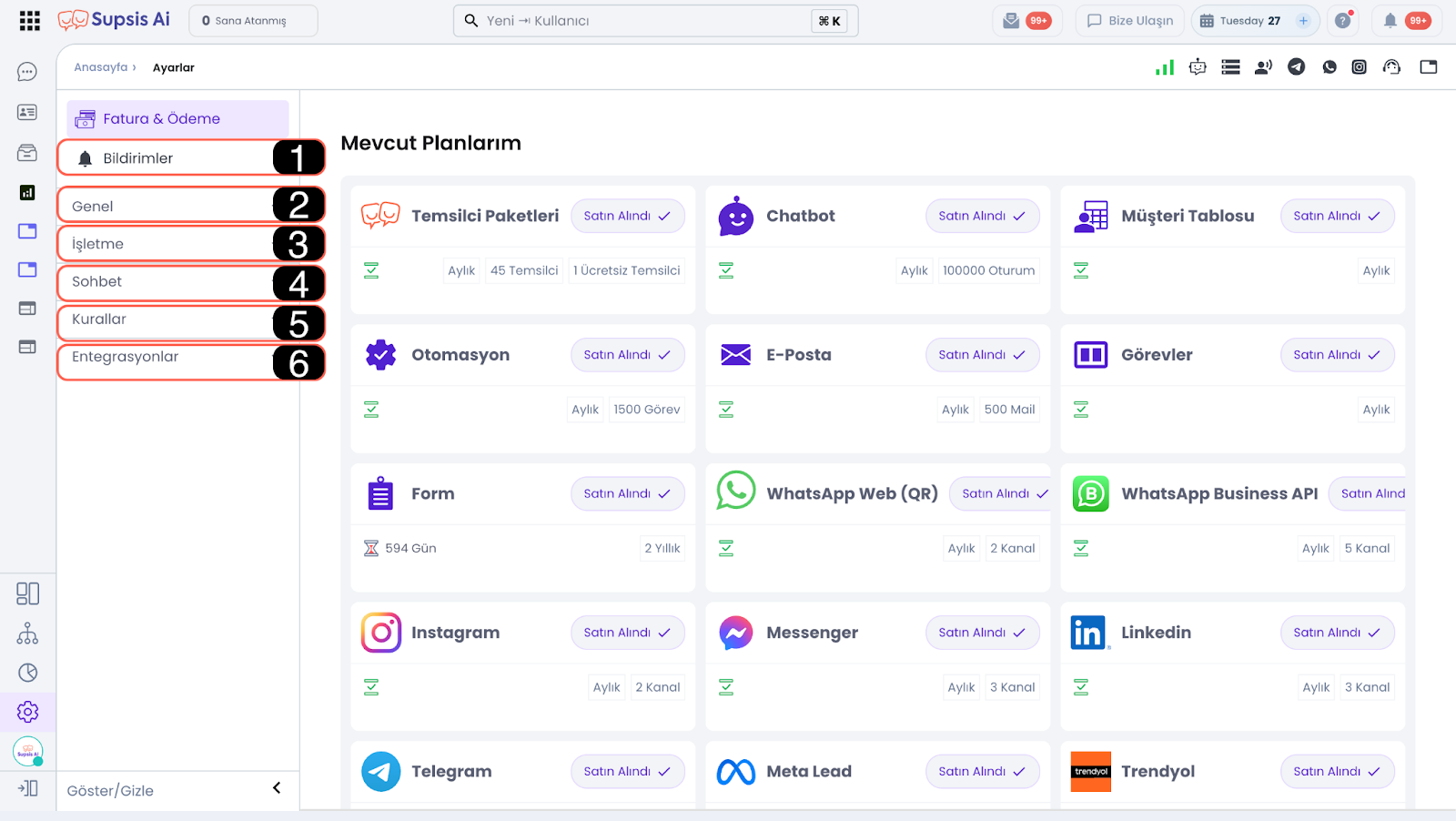 Ayarlar Modülü sayesinde Supsis AI platformu üzerinde sistemsel yapılandırmaları, işletme ayarlarını, sohbet yönetimini, entegrasyonları, otomasyon kurallarını ve bildirim tercihlerinizi tek merkezden yönetebilirsiniz.