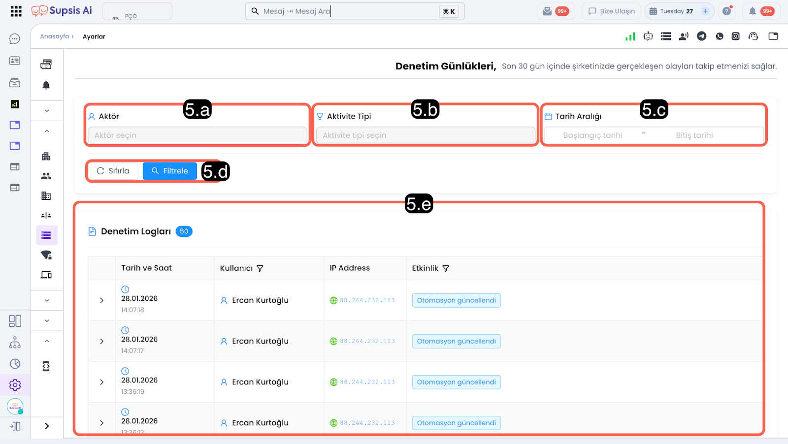 Denetim Günlükleri, Supsis Ai paneli üzerinde gerçekleştirilen tüm kullanıcı aktivitelerinin kayıt altına alındığı izleme alanıdır. Bu bölüm sayesinde hangi kullanıcının, hangi tarihte ve hangi işlemi gerçekleştirdiği detaylı olarak görüntülenebilir.