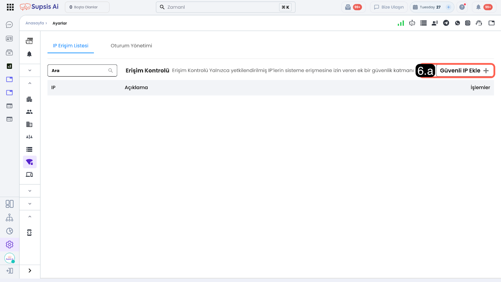 Erişim Kontrolü, Supsis Ai paneline erişimi IP adresi bazında sınırlandırmanızı sağlayan güvenlik mekanizmasıdır. Bu özellik sayesinde panele hangi IP adreslerinden erişim sağlanabileceği kontrol altına alınır.