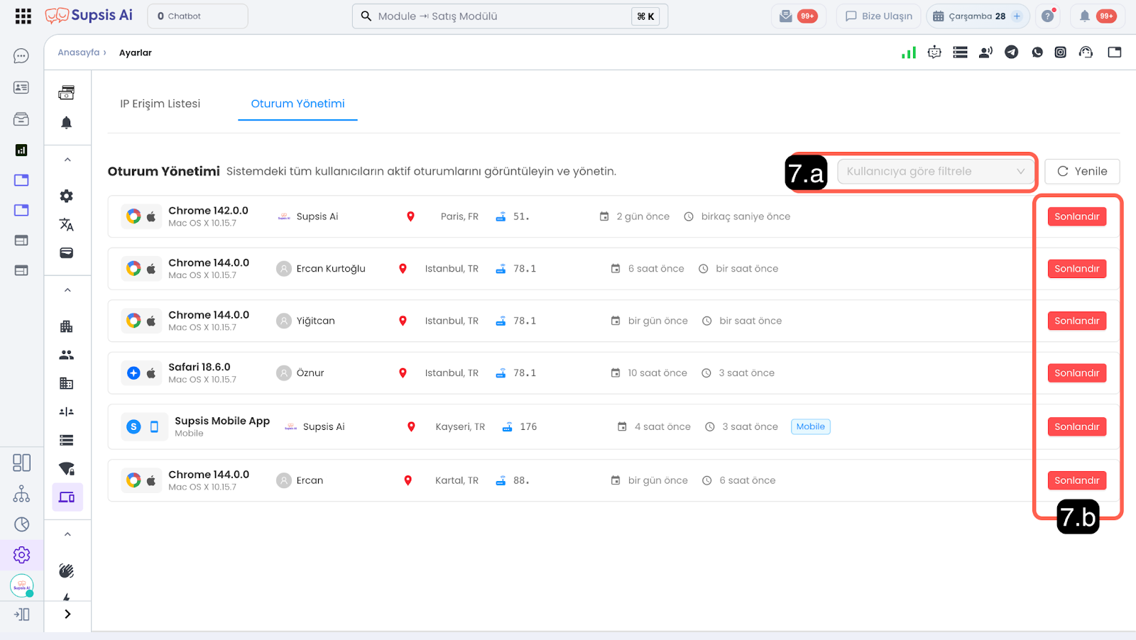 Oturum Yönetimi, panel üzerinde aktif oturumu bulunan kullanıcıların görüntülenmesini, filtrelenmesini ve gerektiğinde oturumlarının sonlandırılmasını sağlayan yönetim alanıdır.
