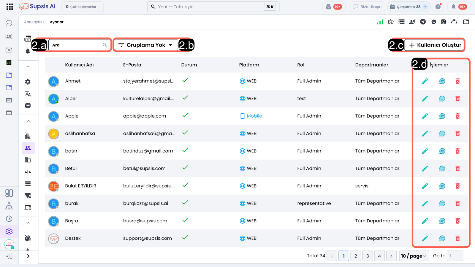 Kullanıcılar menüsü, Supsis Ai paneline erişimi olan kullanıcıların tüm yönetim işlemlerinin gerçekleştirildiği alandır. Bu ekran üzerinden mevcut kullanıcıların detaylı bilgilerine ulaşabilir, yeni kullanıcılar ekleyebilir ve kullanıcıların yetki, rol ve diğer tanımlamalarını güncelleyebilirsiniz.