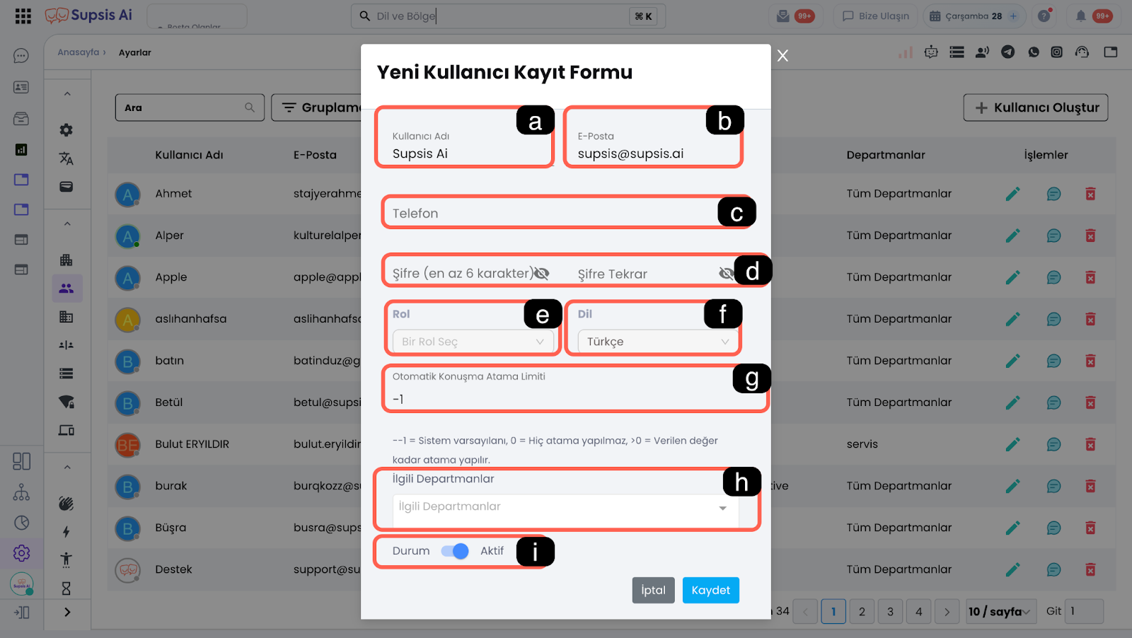 Kullanıcı Oluşturma alanı, Supsis Ai paneline yeni kullanıcı eklemek için kullanılır. Kullanıcı kayıt formu üzerinden belirlenen bilgiler doğrultusunda panele yeni bir kullanıcı tanımlanır.
