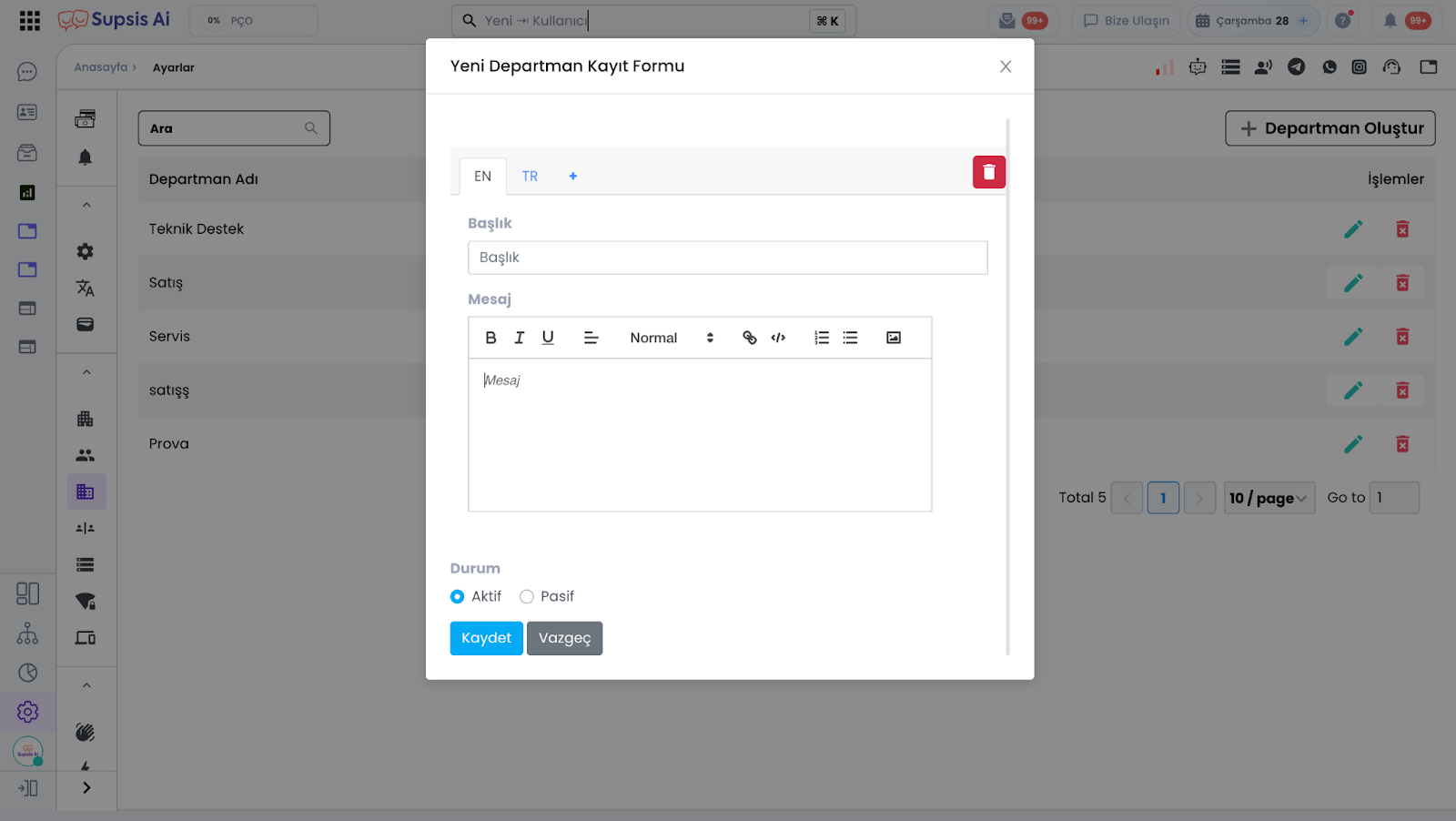 Departman Oluşturma alanı, Supsis Ai paneline yeni bir departman tanımlamak için kullanılır. Belirlenen bilgiler doğrultusunda yeni departman kaydı oluşturulabilir.
