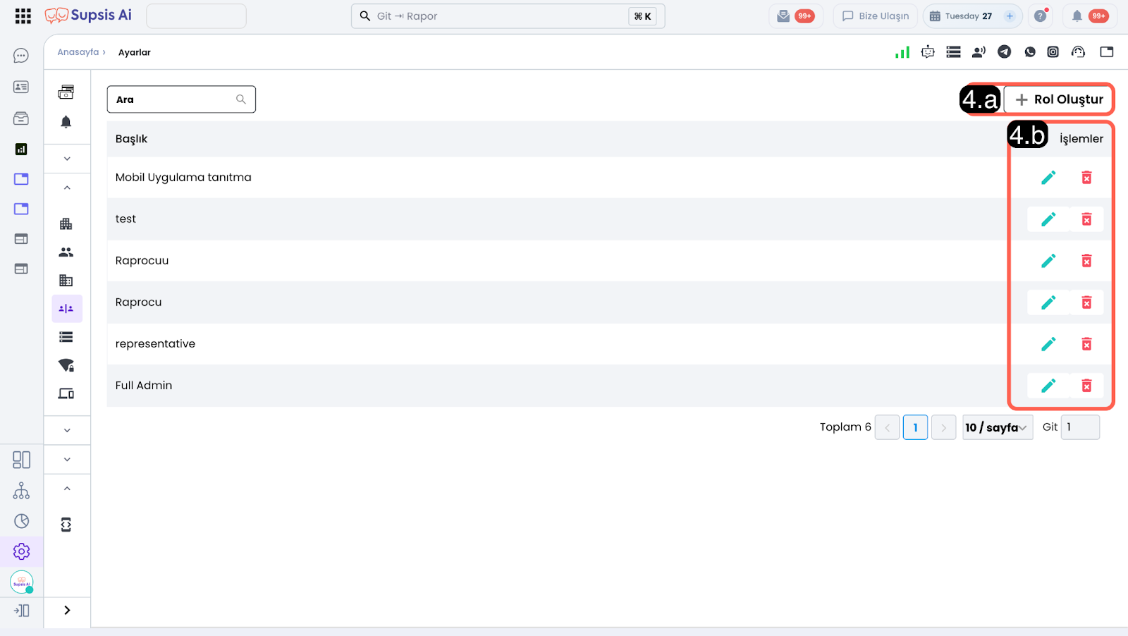 Oluşturulan roller üzerinde düzenleme ve silme işlemleri bu alan üzerinden gerçekleştirilir.