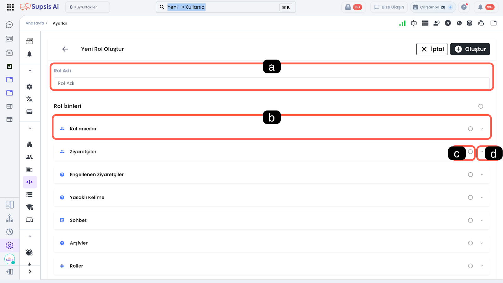 Roller, Supsis Ai paneli içerisinde kullanıcıların hangi modüllere erişebileceğini ve hangi işlemleri gerçekleştirebileceğini belirleyen yetkilendirme yapılarıdır. Her kullanıcı, kendisine atanan rol doğrultusunda yalnızca izin verilen alanlara erişebilir ve yetkileri kapsamında işlem yapabilir.