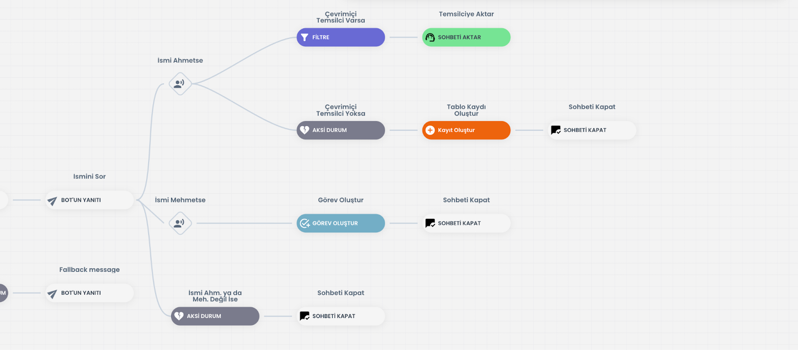 Bu filtreleme doğrultusunda kullanıcı, chatbot diyagramında bir sonraki kullanıcı girişi ya da filtreleme ya da aktarım/yönlendirme yapan blok dalına kadar ilerler. İlerlenen karar ağacı dallarında bulunan bloklardaki tanımlı işlevler tetiklenir.