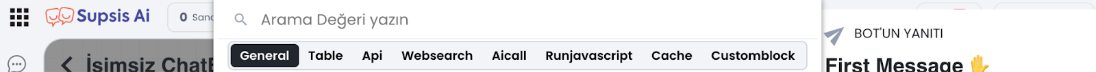 Harici Kaynak Sorguları: API, yapay zeka, websearch, diğer Supsis Ai modülleri gibi chatbotun dış kaynak sorgusu yaparak öğrenebileceği veriler.