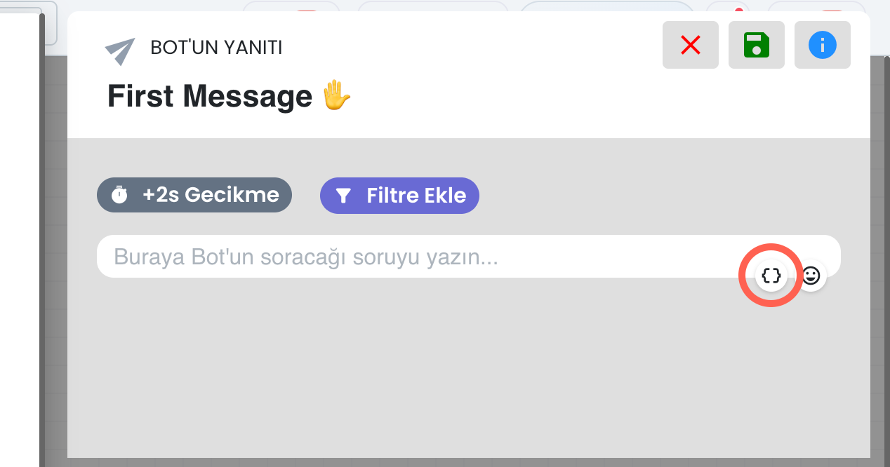 Dinamik değerler, birçok chatbot bloğu içerisinde kişiselleştirme ve filtreleme için kullanılabilmektedir. Bu özelliğin kullanımına izin veren bloklarda, ekranda yer alan süslü parantez ({ }) ikonu bulunur. Bu ikona tıklayarak dinamik değer seçiciyi açabilirsiniz.