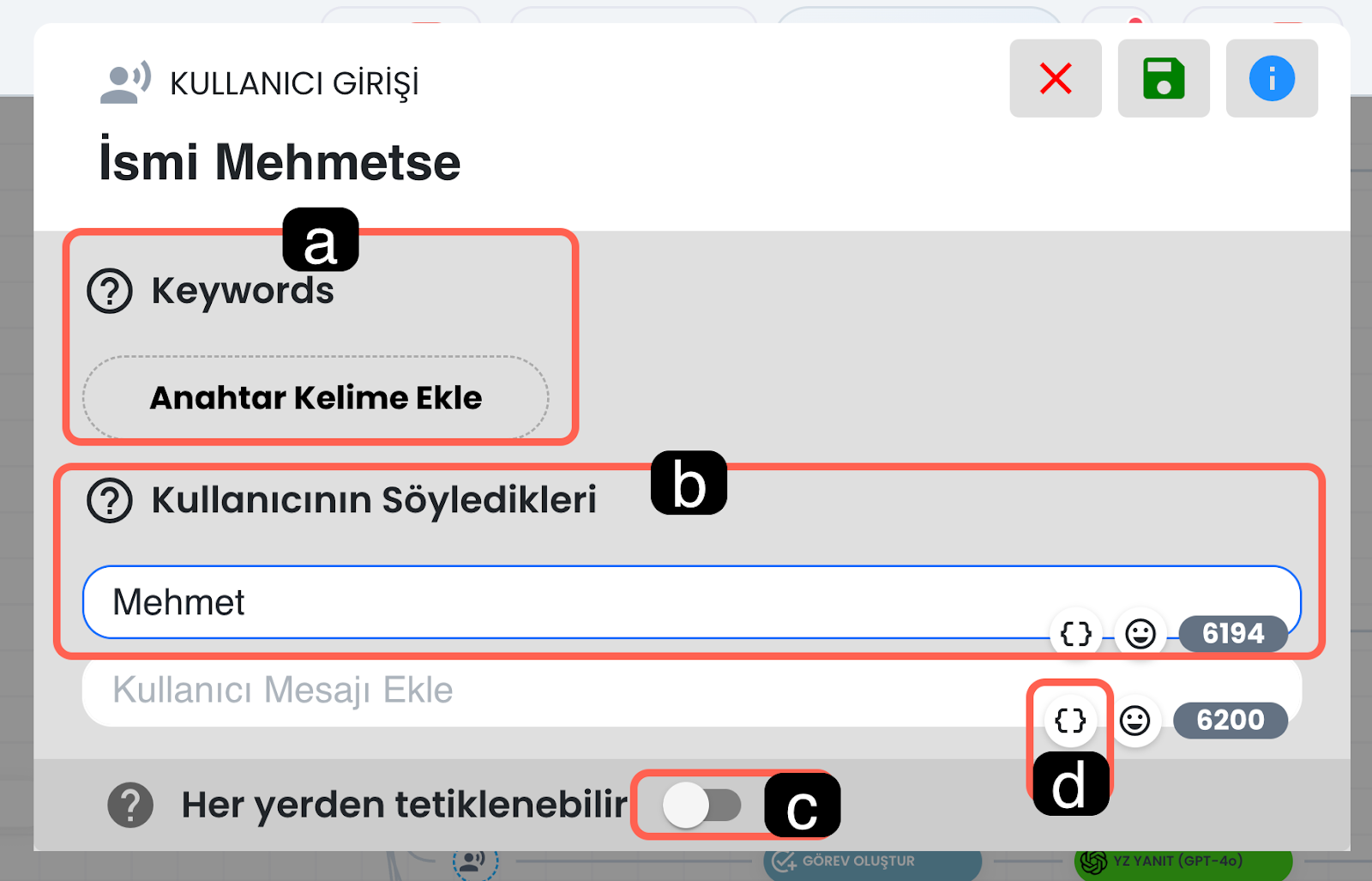 Bu alan, kullanıcının bu adımı tetiklemesi için yazması beklenen ifade örneklerini tanımladığınız bölümdür. Sistem, kullanıcının yazdığı mesajı bu ifadeler ve anahtar kelimelerle birlikte değerlendirerek doğru kullanıcı girişini eşleştirir. Özellikle butonla gönderilen metinleri veya kullanıcıdan beklenen kısa yanıtları yakalamak için kullanışlıdır