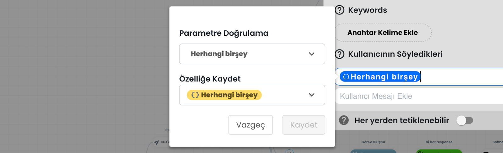 Bu alan, kullanıcının mesajını yakalamak için kullanılan tetikleyici kelime veya kelime gruplarını tanımladığınız bölümdür. Anahtar ifadeler iki farklı mantıkla çalışabilir: