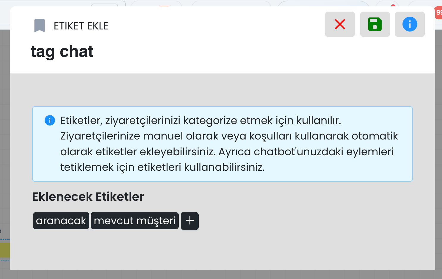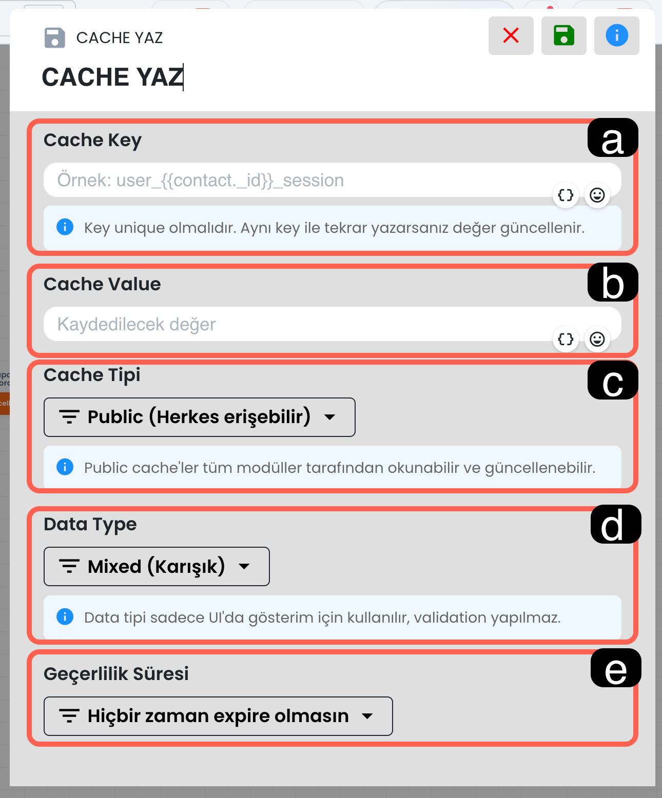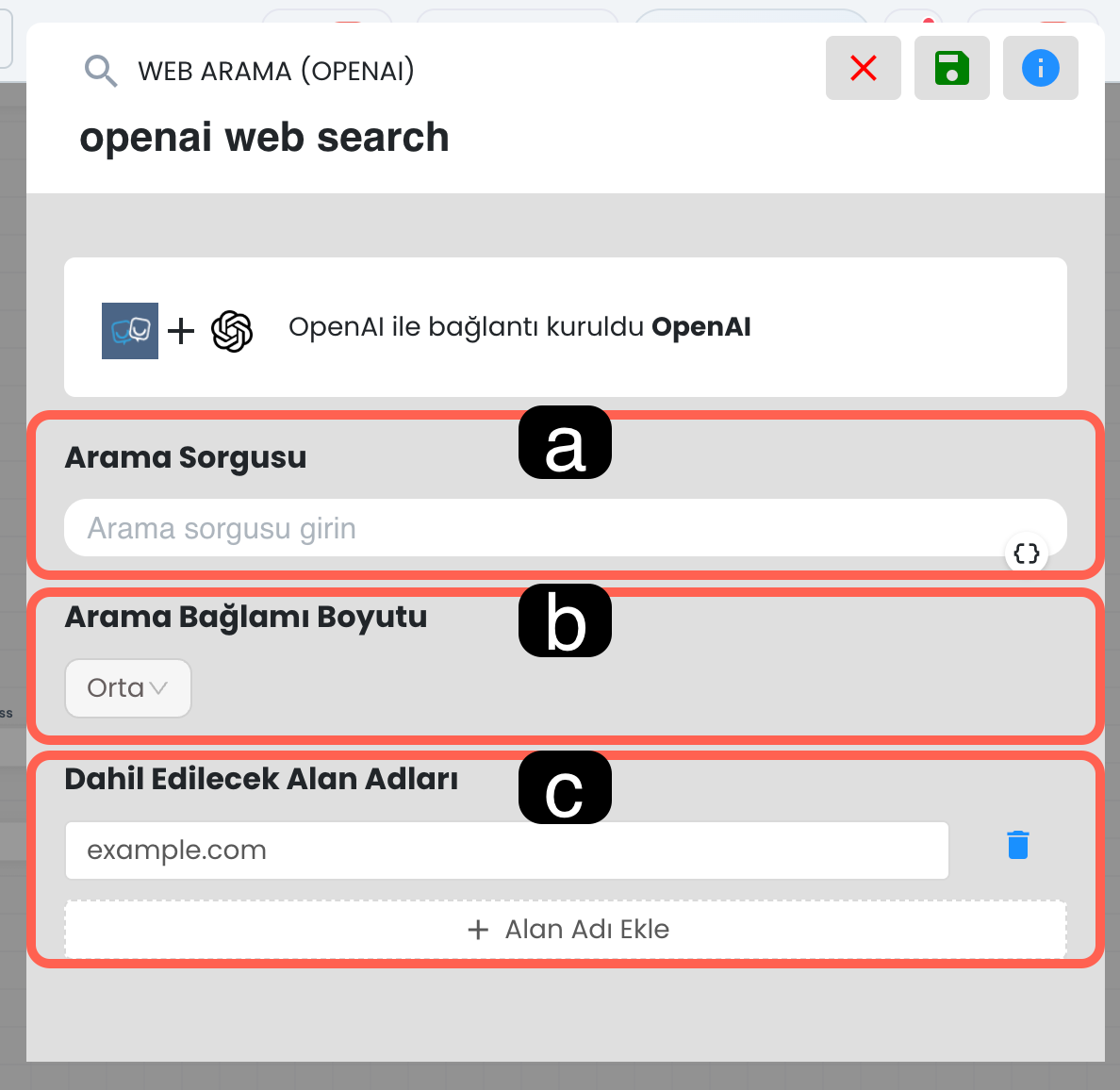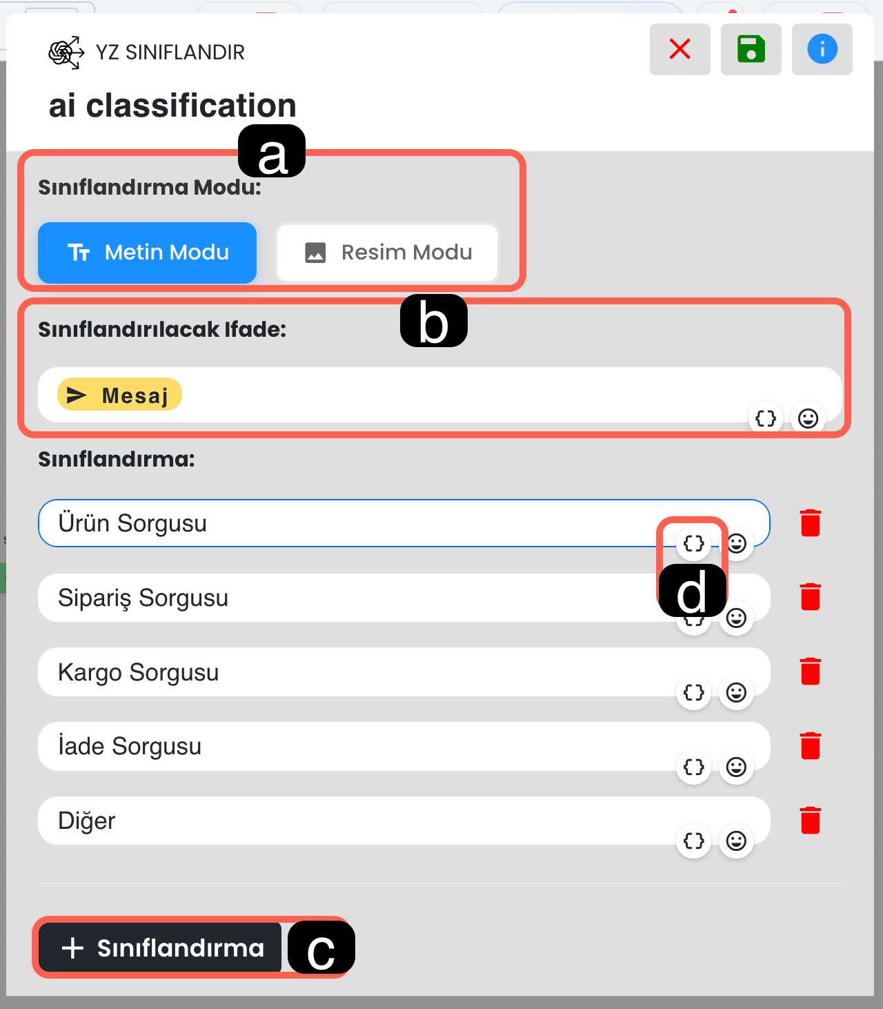 İfade ve kategori alanlarında süslü parantez simgesini kullanarak ilgili alana dinamik değer ekleyebilirsiniz. Böylece yapay zeka yalnızca sabit bir metni değil, senaryo sırasında oluşmuş dinamik verileri de sınıflandırma işleminde kullanılabilir.