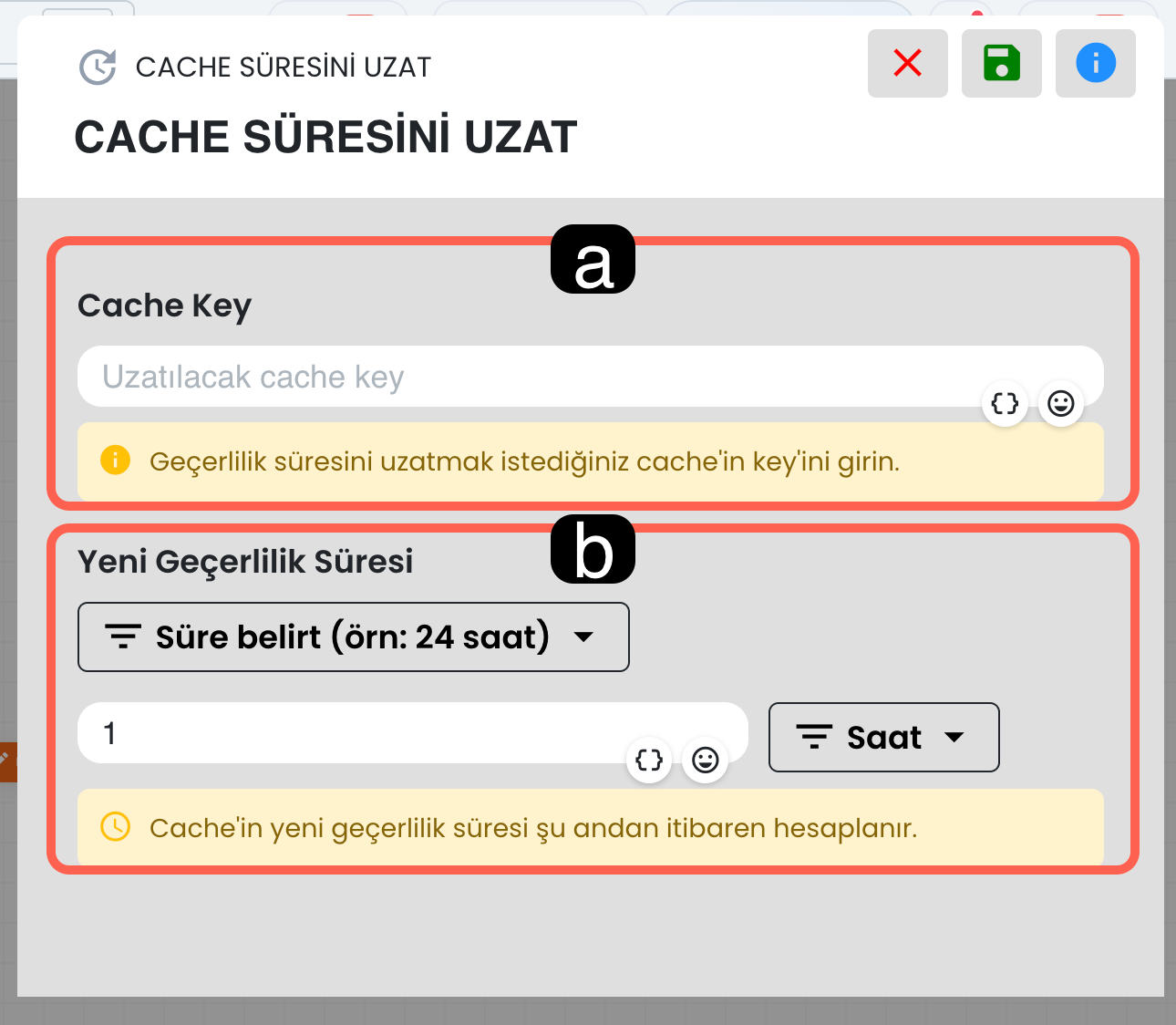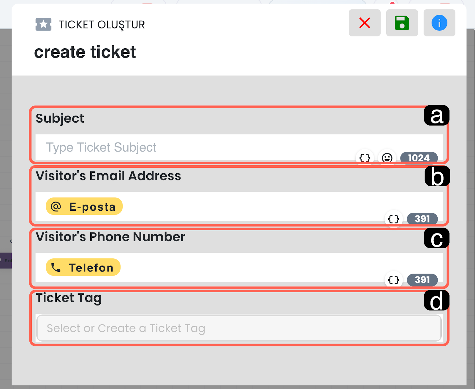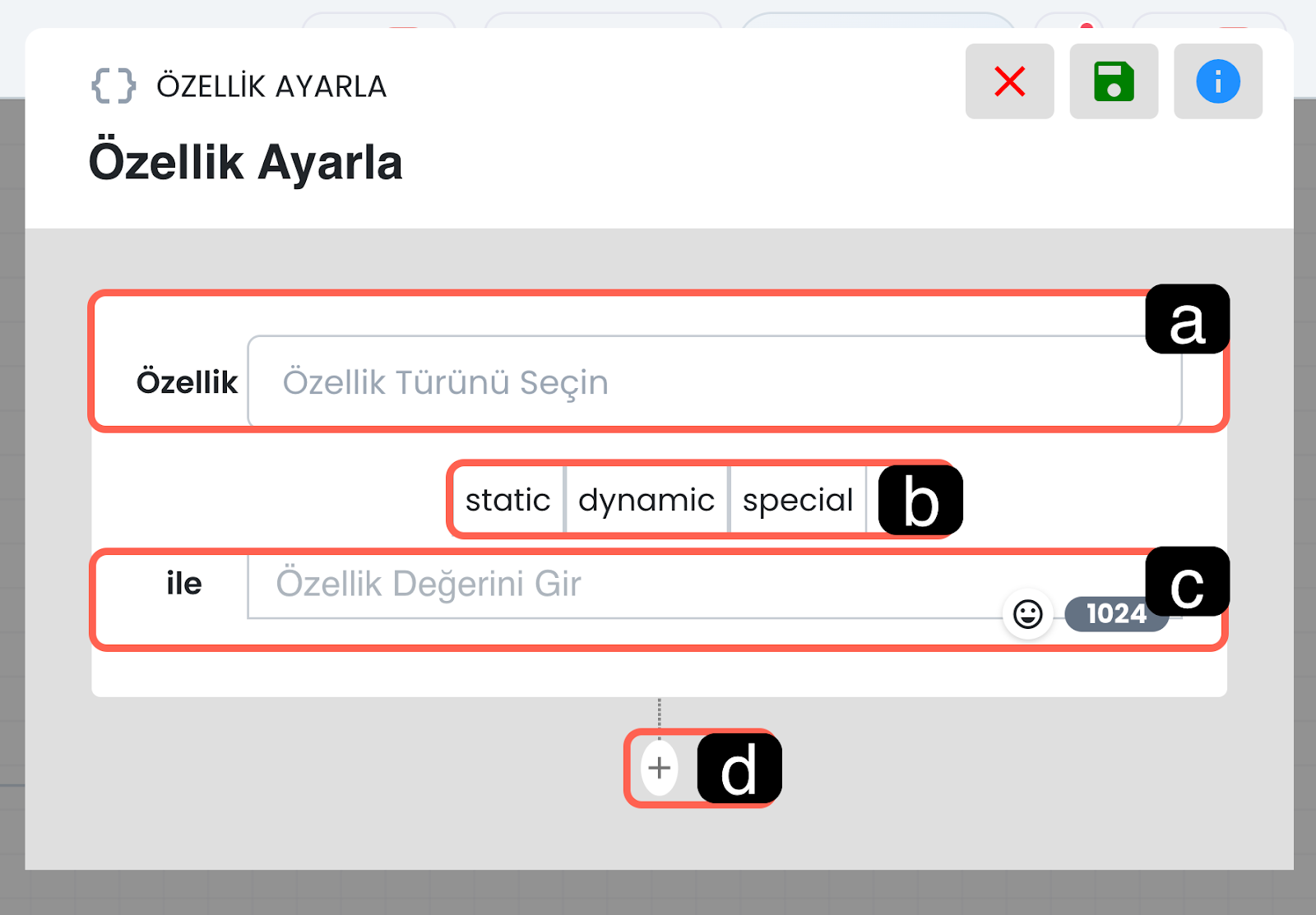 İfade ve kategori alanlarında süslü parantez simgesini kullanarak ilgili alana dinamik değer ekleyebilirsiniz. Böylece yapay zeka yalnızca sabit bir metni değil, senaryo sırasında oluşmuş dinamik verileri de sınıflandırma işleminde kullanılabilir.