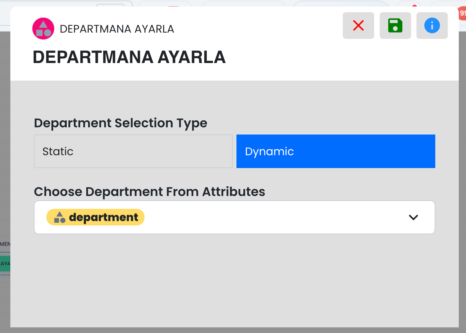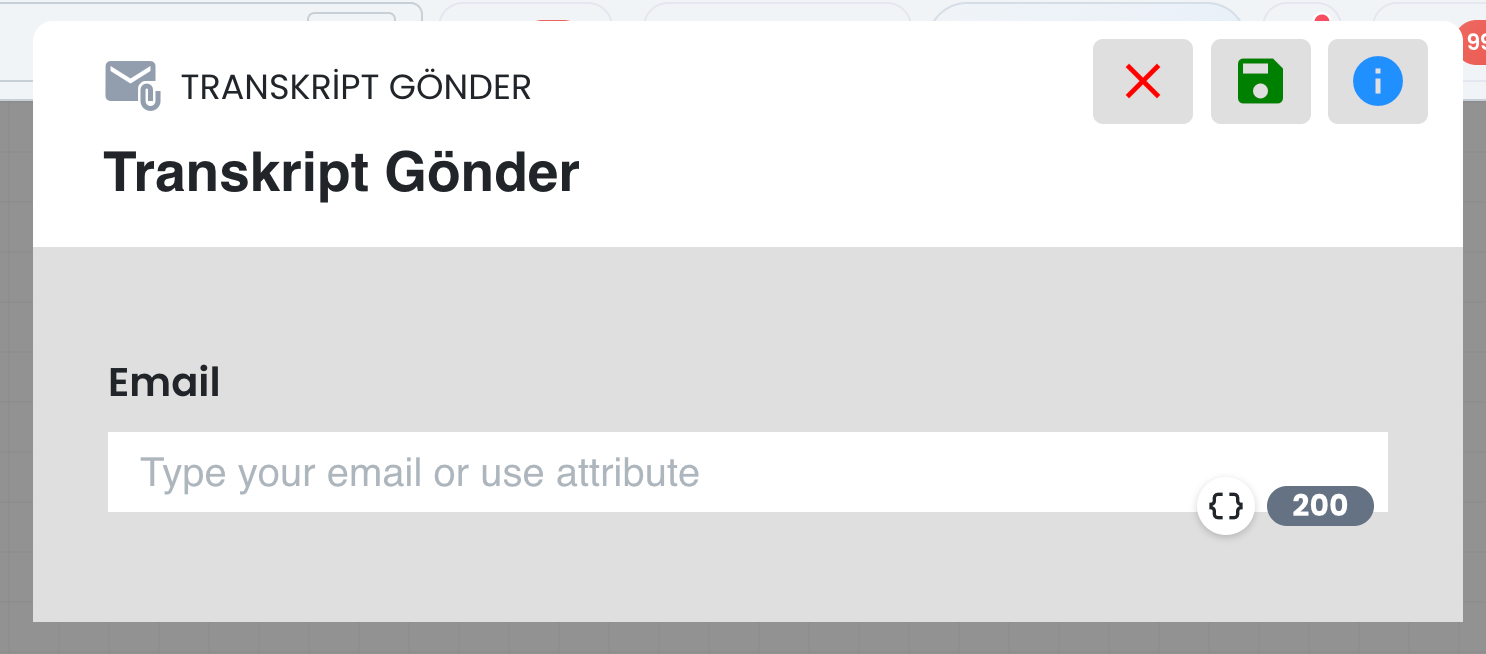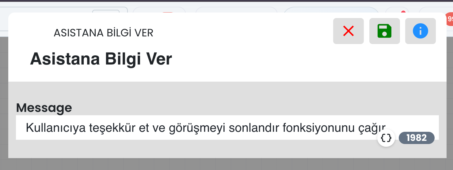 Mesaj alanının yanındaki süslü parantez simgesi üzerinden dinamik değer ekleyebilirsiniz. Dinamik değerler, görüşme yapılan kullanıcıya ait; kişi kartında bulunan bilgiler, kullanıcıdan alınan yanıtlar, harici kaynaktan dönen sonuçlar vb. kişisel değerlerdir. (bkz: Dinamik Değerler)