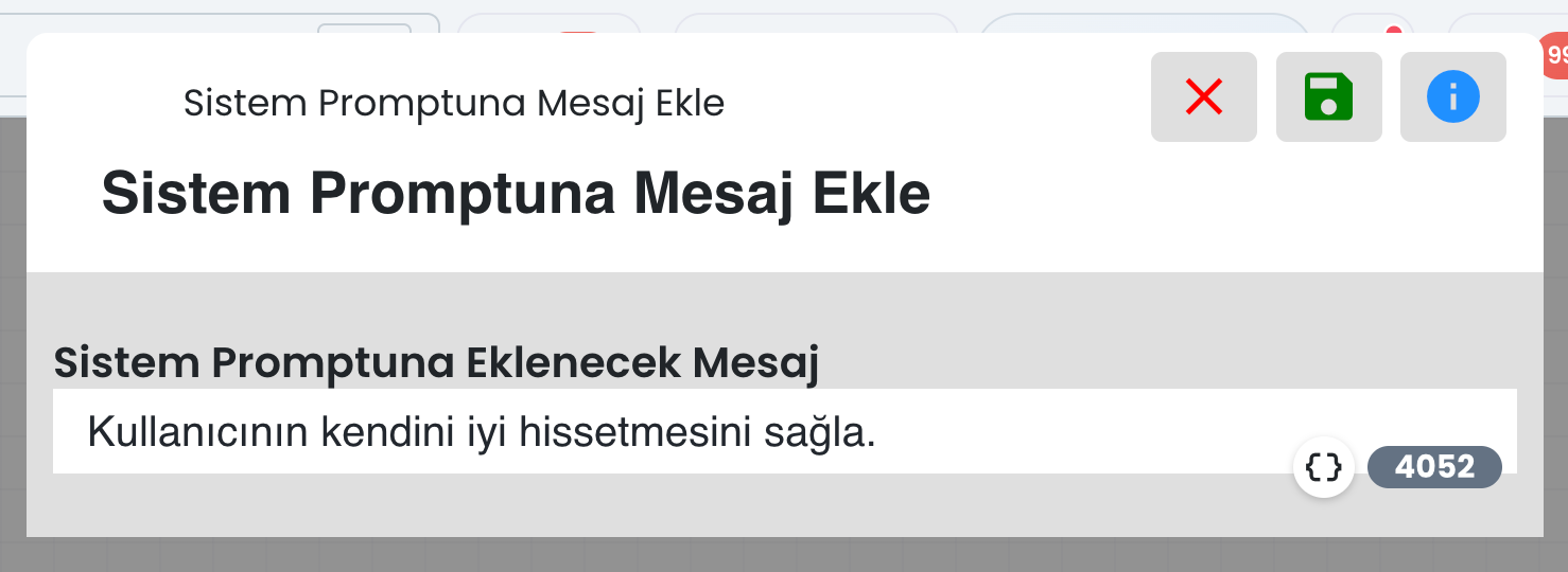 Dinamik değerleri prompt alanına ekleyerek, yapay zekanın kullanıcıya özel içerik üretmesini sağlayabilirsiniz. Dinamik değerler, görüşme yapılan kullanıcıya ait; kişi kartında bulunan bilgiler, kullanıcıdan alınan yanıtlar, harici kaynaktan dönen sonuçlar vb. kişisel değerlerdir. (bkz: Dinamik Değerler)