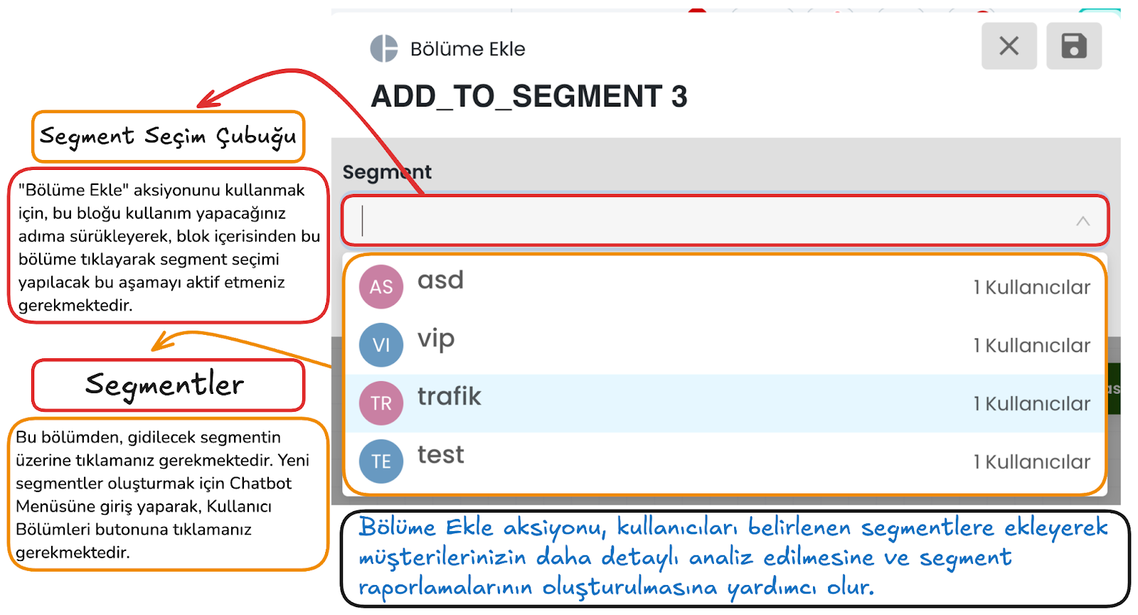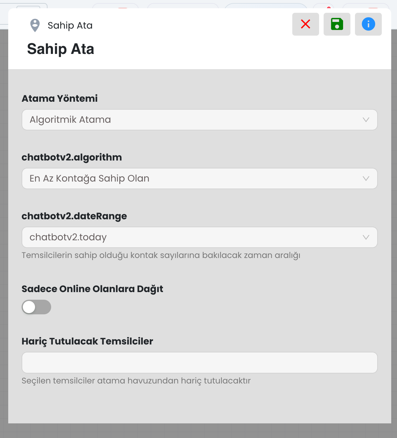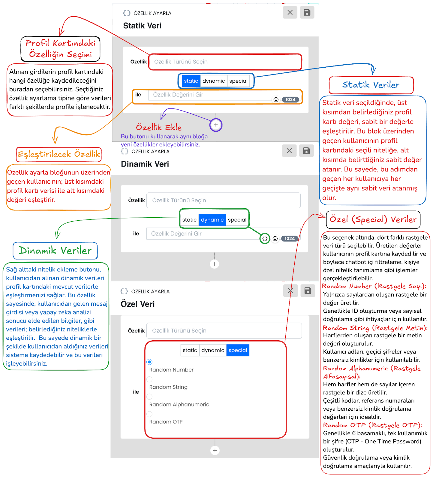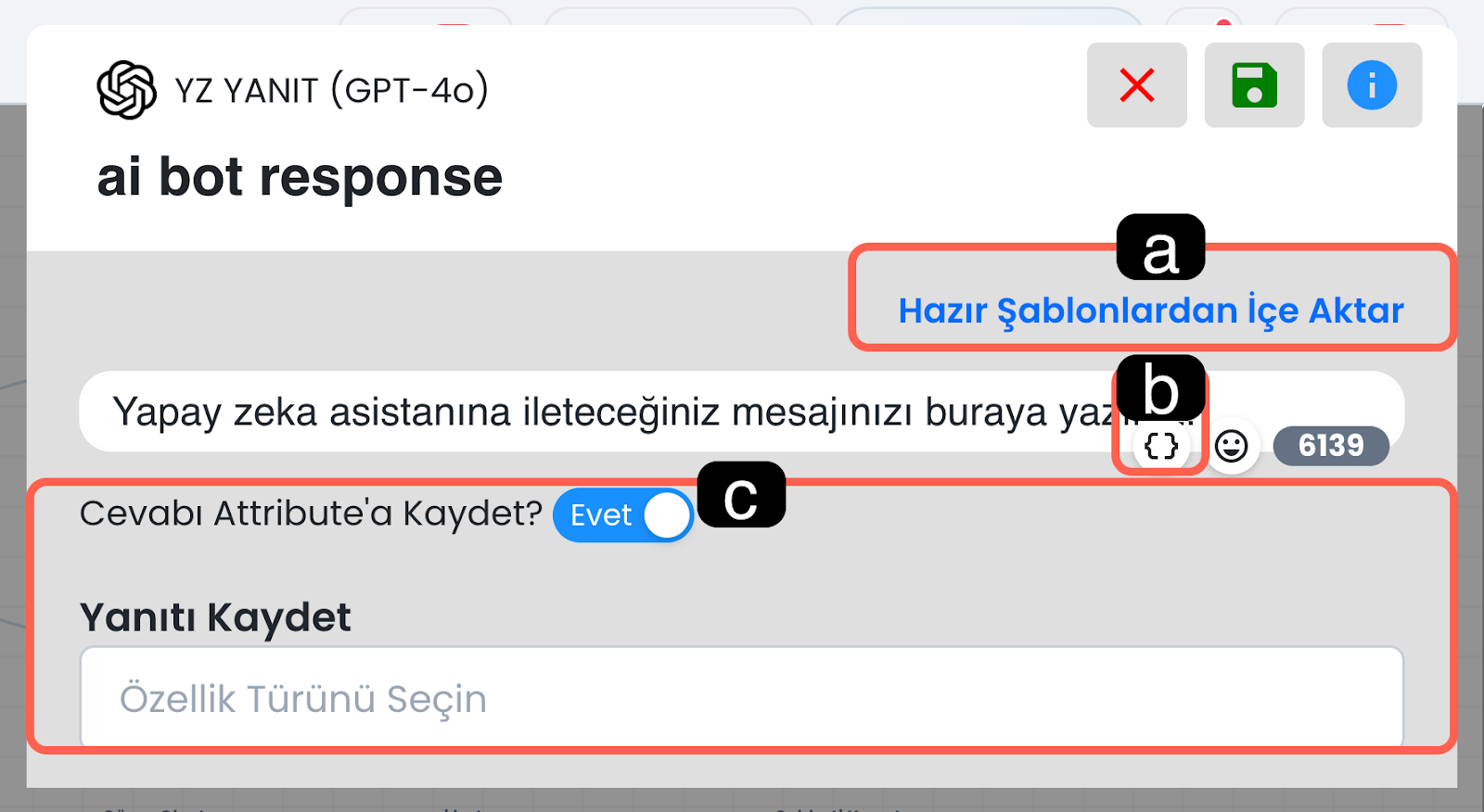 Bu alan, kullanıcıdan alınan verinin seçilen bir özelliğe kaydedilmesini sağlar. Böylece örneğin kullanıcının yazdığı e-posta adresi, telefon numarası veya başka bir bilgi profil kartına ya da ilgili kayıt alanına alınabilir. Kaydedilen veriler daha sonra filtreleme, segmentasyon ve kişiselleştirilmiş yanıt üretimi için tekrar kullanılabilir.
