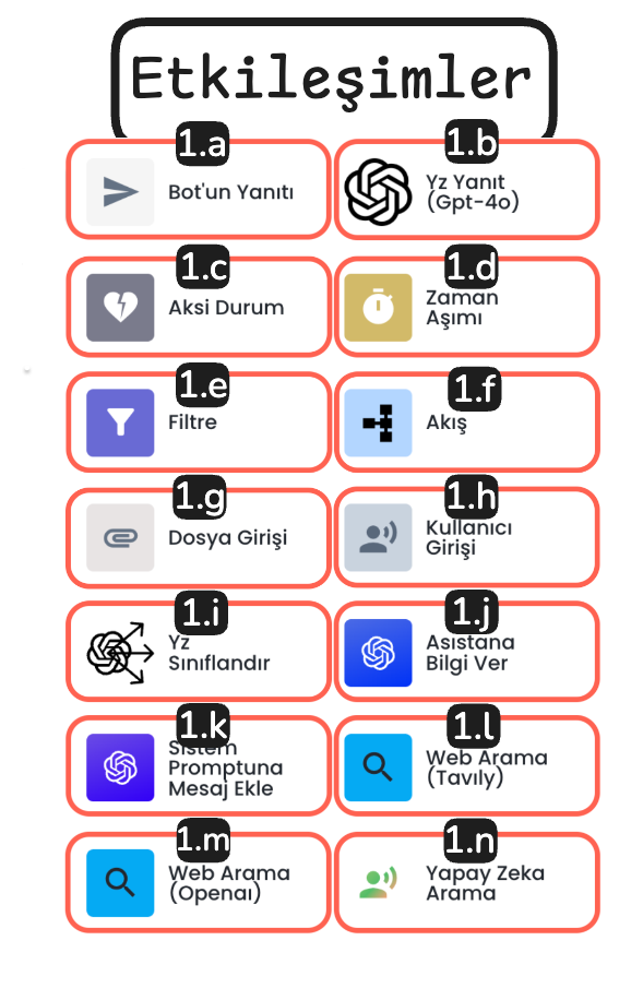 Etkileşim blokları, chatbota; kullanıcıyı anlama ve onunla doğru iletişim kurma becerilerini sağlayan bloklardır. Bu bloklar bir chatbot senaryosunun temelini oluşturur.