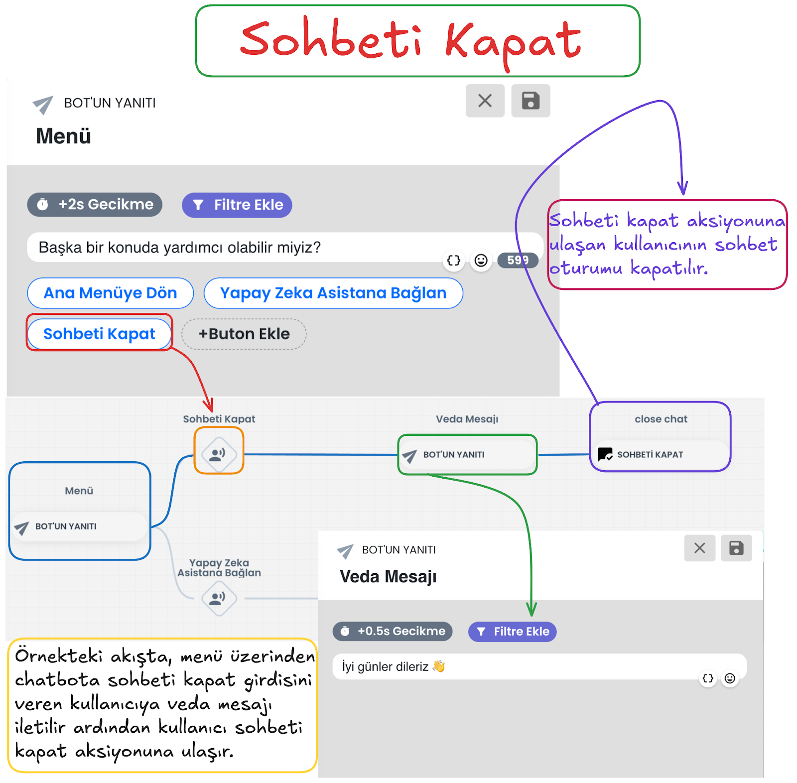 - Global anahtar kelimeler, chatbotun tamamında geçerlidir. Kullanıcı bu ifadelerden birini yazdığında, bulunduğu adımdan bağımsız olarak ilgili kullanıcı girişi tetiklenebilir.