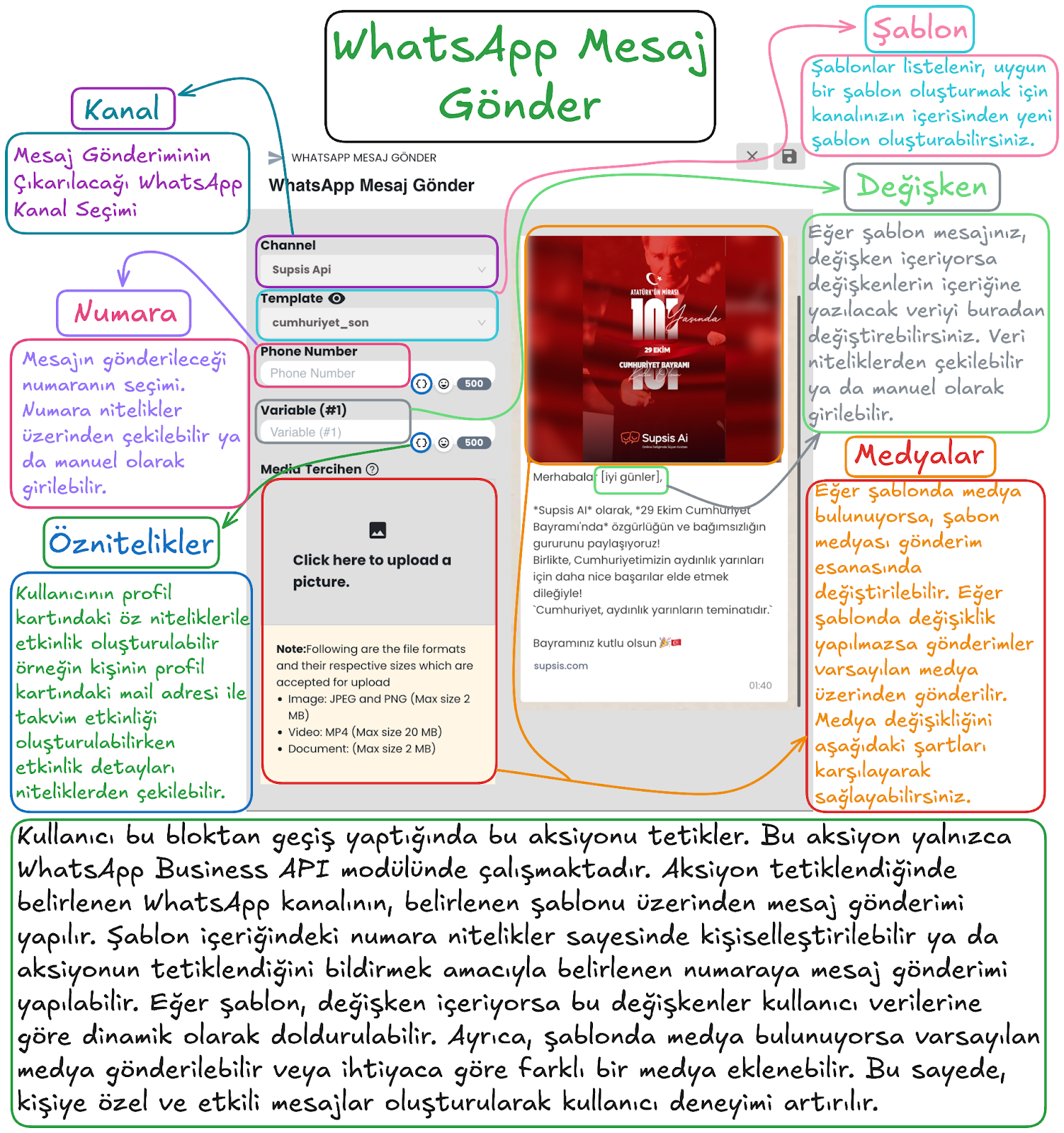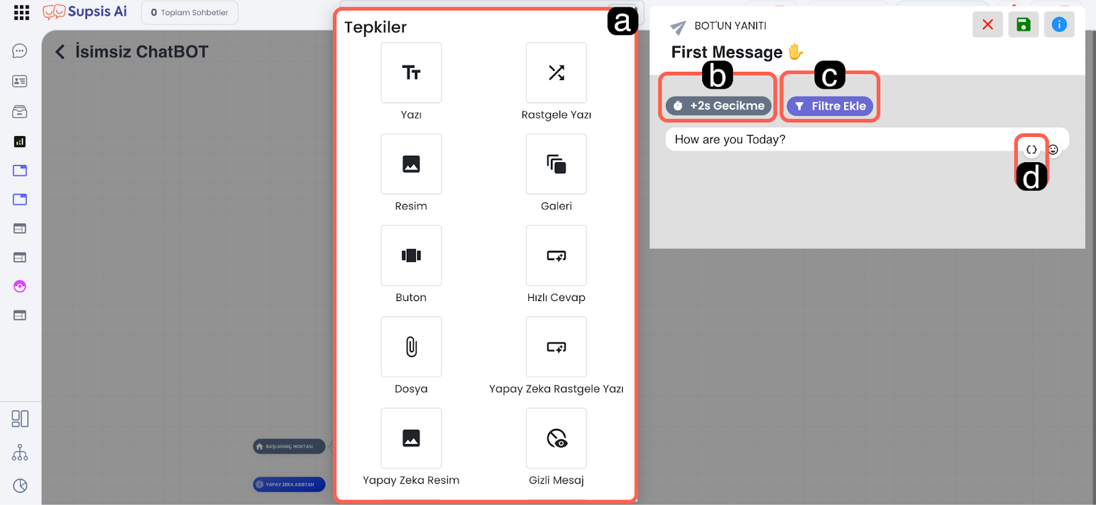 - Gizli Mesaj: Chatbotun, yalnızca Supsis Ai paneli üzerinden görüntülenebilen gizli mesajlar gönderebilmesini sağlar.