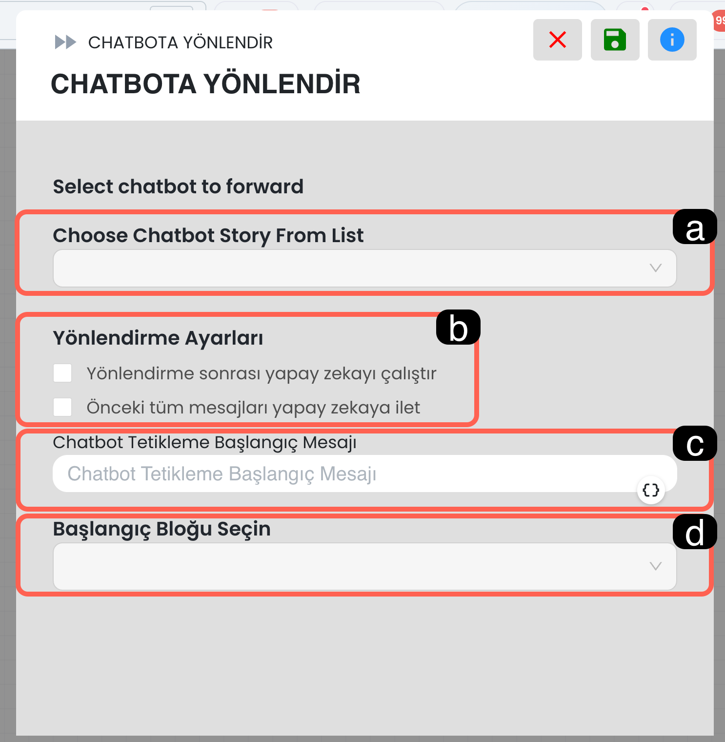 Akış bloğu, chatbot senaryosunun belirli bir bölümünü tek bir yapı altında toplamak için kullanılır. Özellikle büyüyen ve dallanan senaryolarda diyagramı sadeleştirir, okunabilirliği artırır ve düzenlemeyi kolaylaştırır. Bu blok, akış içerisinde herhangi bir etkileşime yol açan bir blok değildir, senaryonuzun belirli parçalarını daha düzenli yönetebilmeniz için kullanılan yapısal bir düzenleme bloğudur. Akış bloğunun içine girerek o bölümdeki alt adımları toplu halde görüntüleyebilir ve düzenleyebilirsiniz.