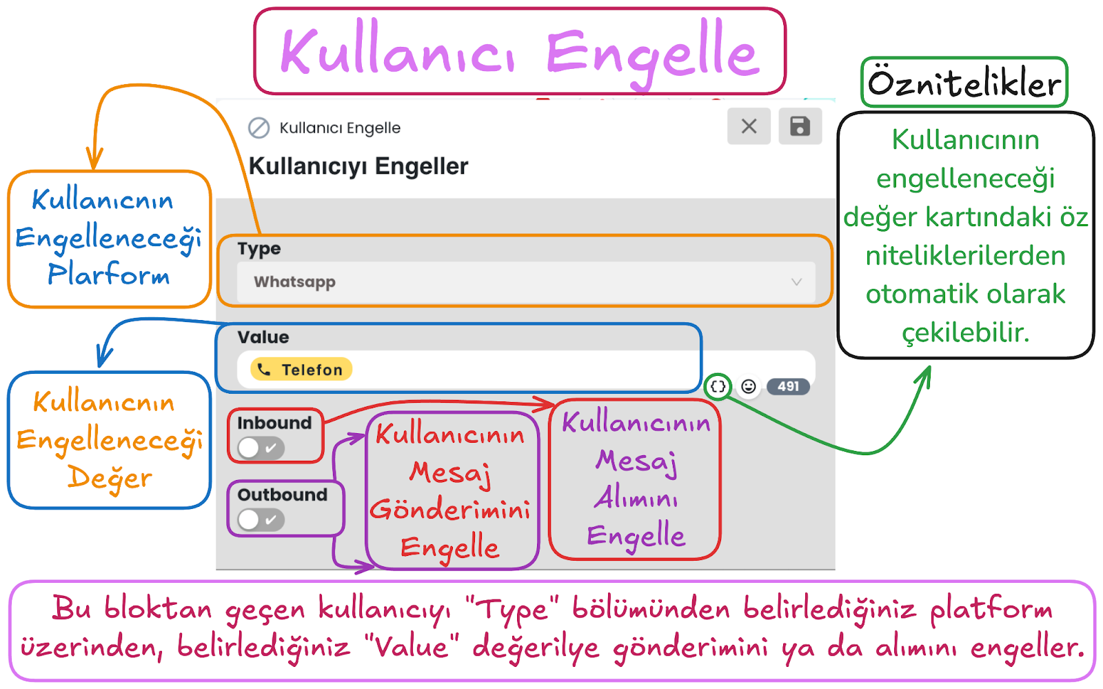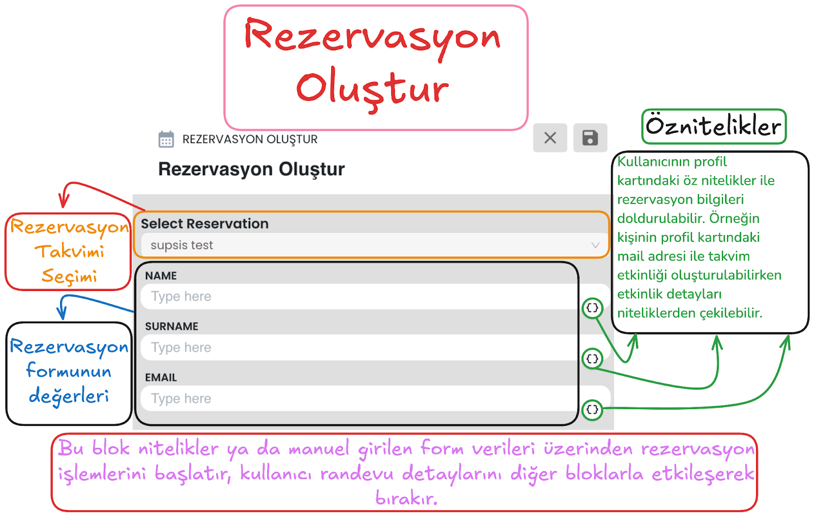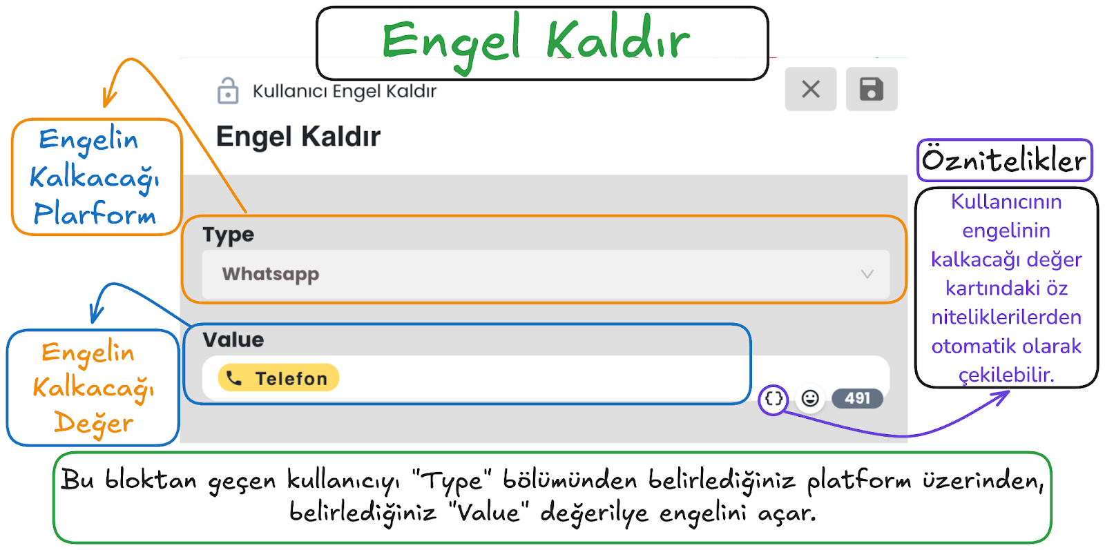 Kullanıcı Girişi bloğundaki metin alanlarına süslü parantez simgesi üzerinden dinamik değer ekleyebilirsiniz. Böylece kullanıcıya ait profil bilgileri, daha önce toplanmış veriler veya senaryo içinde oluşan başka değerler giriş kurgusuna dahil edilebilir. Bu özellik, özellikle kişiselleştirilmiş akışlar kurarken veya bir önceki adımdan gelen veriye göre yeni bir kullanıcı girişi tanımlarken kullanışlıdır.