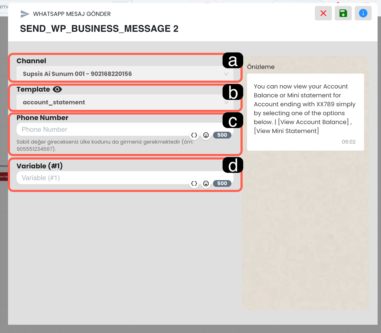 Sipariş seçimi sonucunda dönen veriler bu alanda listelenir. Bu bilgiler chatbot senaryosu içerisinde daha sonraki bloklarda kullanılabilir.