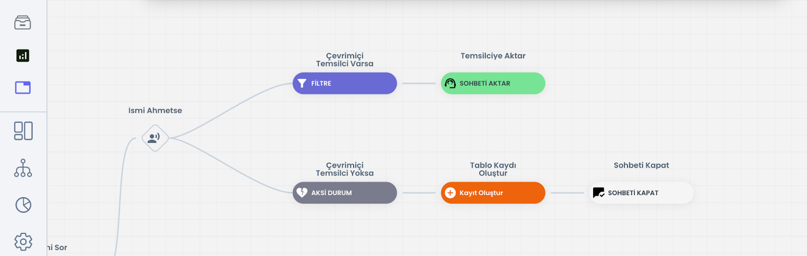 Bu alan, mevcut filtre yapısına yeni bir grup eklemenizi sağlar. Özellikle alternatif senaryolar kurarken kullanışlıdır. Örneğin bir grup “mesai saatleri”, başka bir grup “çevrimiçi temsilci durumu”, üçüncü bir grup ise “kullanıcı segmenti” için oluşturulabilir. Böylece tek bir filtre bloğu içinde daha güçlü ve okunabilir karar yapıları kurulabilir. Senaryo içinde kullanıcı ilgili filtrelerden geçer; hiçbir koşul sağlanmazsa kullanıcıyı Aksi Durum gibi alternatif bir akışa yönlendirebilirsiniz