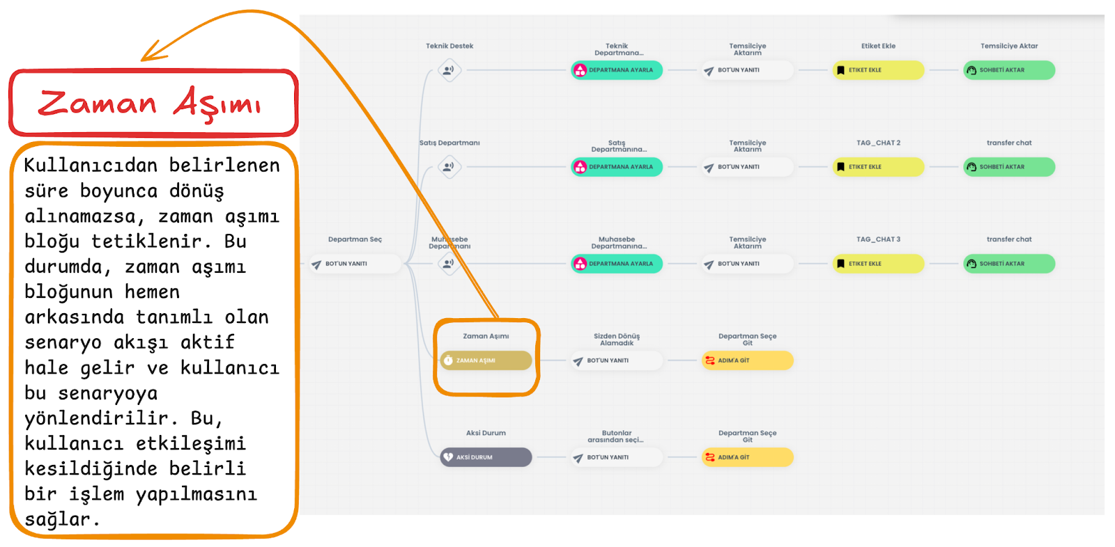 Zaman Aşımı bloğu, kullanıcıdan belirli bir süre boyunca yanıt gelmediğinde devreye giren alternatif senaryodur. Bu blok, belirlenen süre içerisinde mesaj atmayan kullanıcıları alternatif bir senaryo akışına yönlendirmek için kullanılır. Zaman aşımı, yalnızca kullanıcı girişi blokları ile tasarlanan akış adımlarında kullanılabilir.