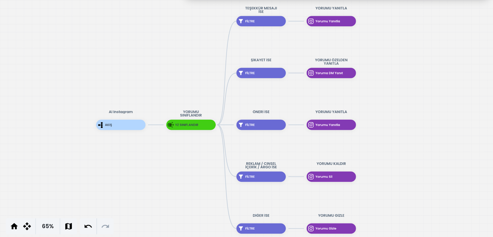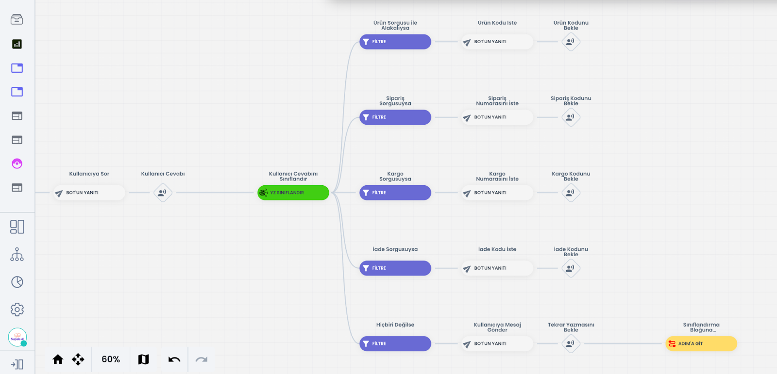 YZ Sınıflandır bloğu, kullanıcıdan gelen içeriği yapay zeka yardımıyla analiz ederek önceden belirlediğiniz kategorilere ayırır. Bu sayede kullanıcı taleplerini niyetlerine göre otomatik olarak sınıflandırabilir, her sınıf için farklı aksiyonlar tanımlayabilir ve daha düzenli bir senaryo yapısı kurabilirsiniz. Sınıflandırma sonucu doğrultusunda filtre bloklarını kullanılarak kullanıcıları farklı akışlara yönlendirebilirsiniz.