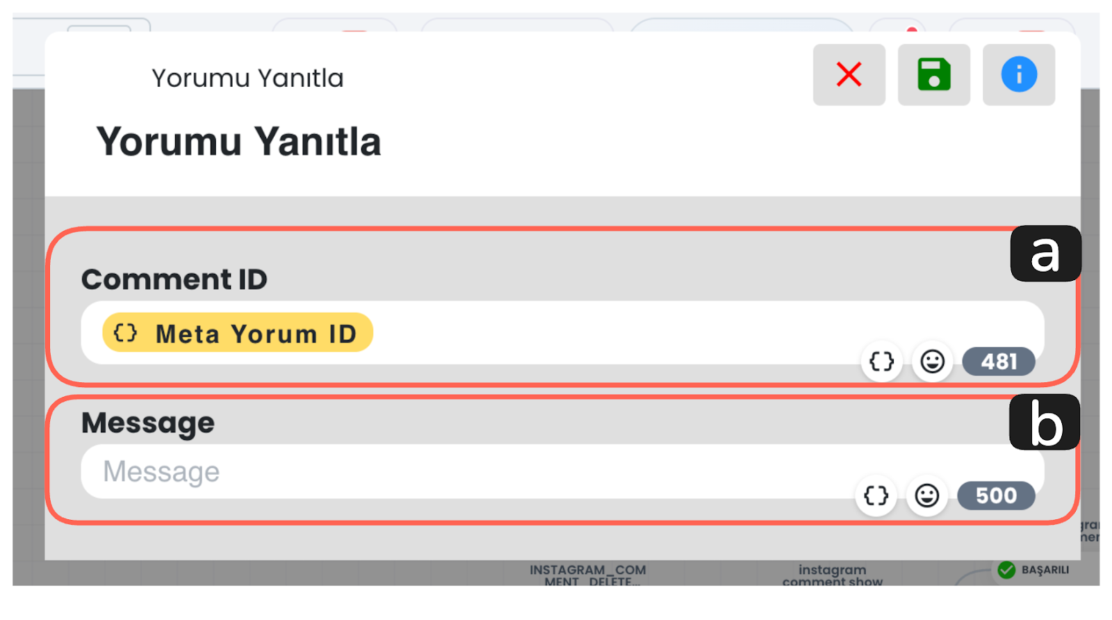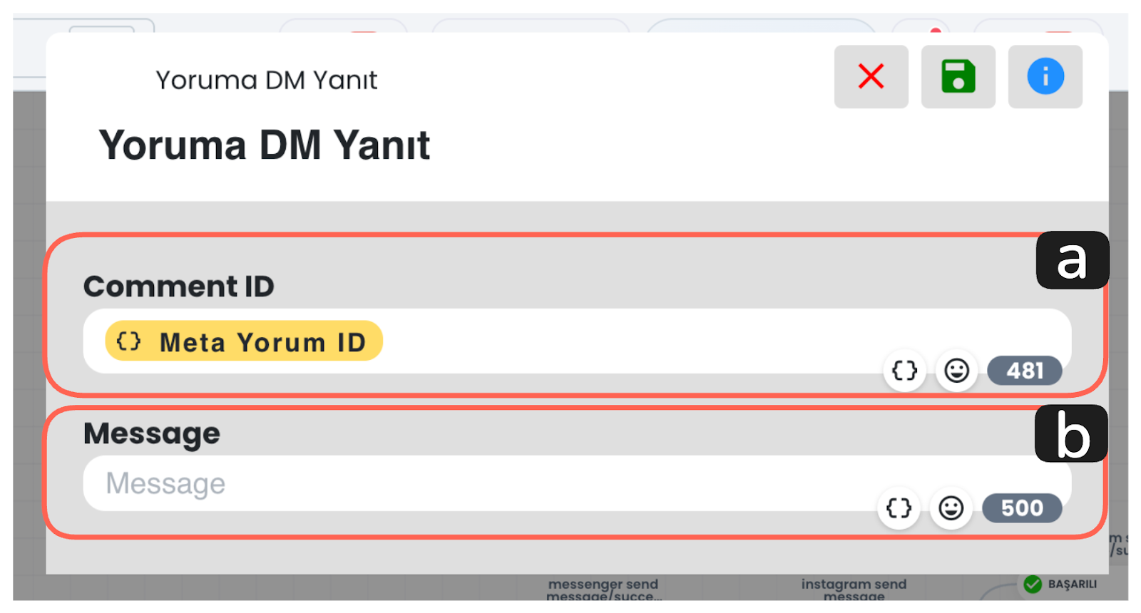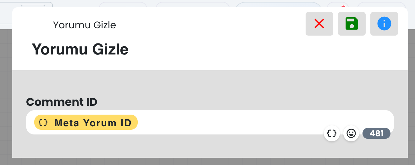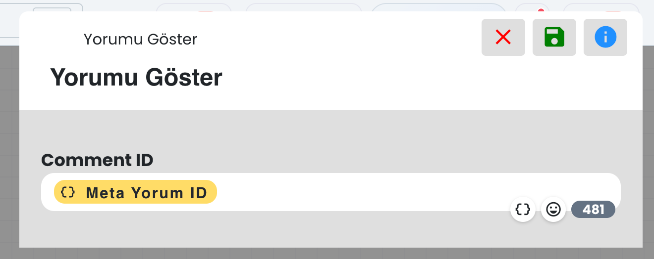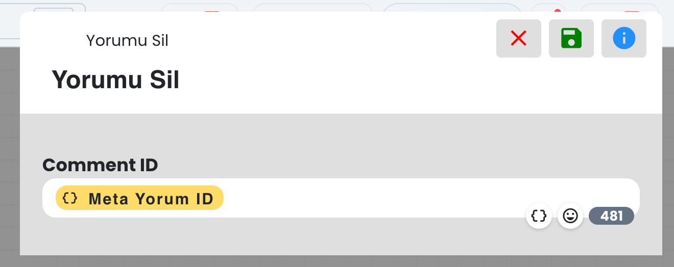Bu alan, DM yanıt gönderilecek yorumu belirler. Chatbot senaryo tetikleyicisinin, Meta yorumu olduğu durumlarda, görseldeki gibi Meta Yorum ID değerinin kullanılması, chatbot işleminin doğru yorum için yapılmasını sağlar.