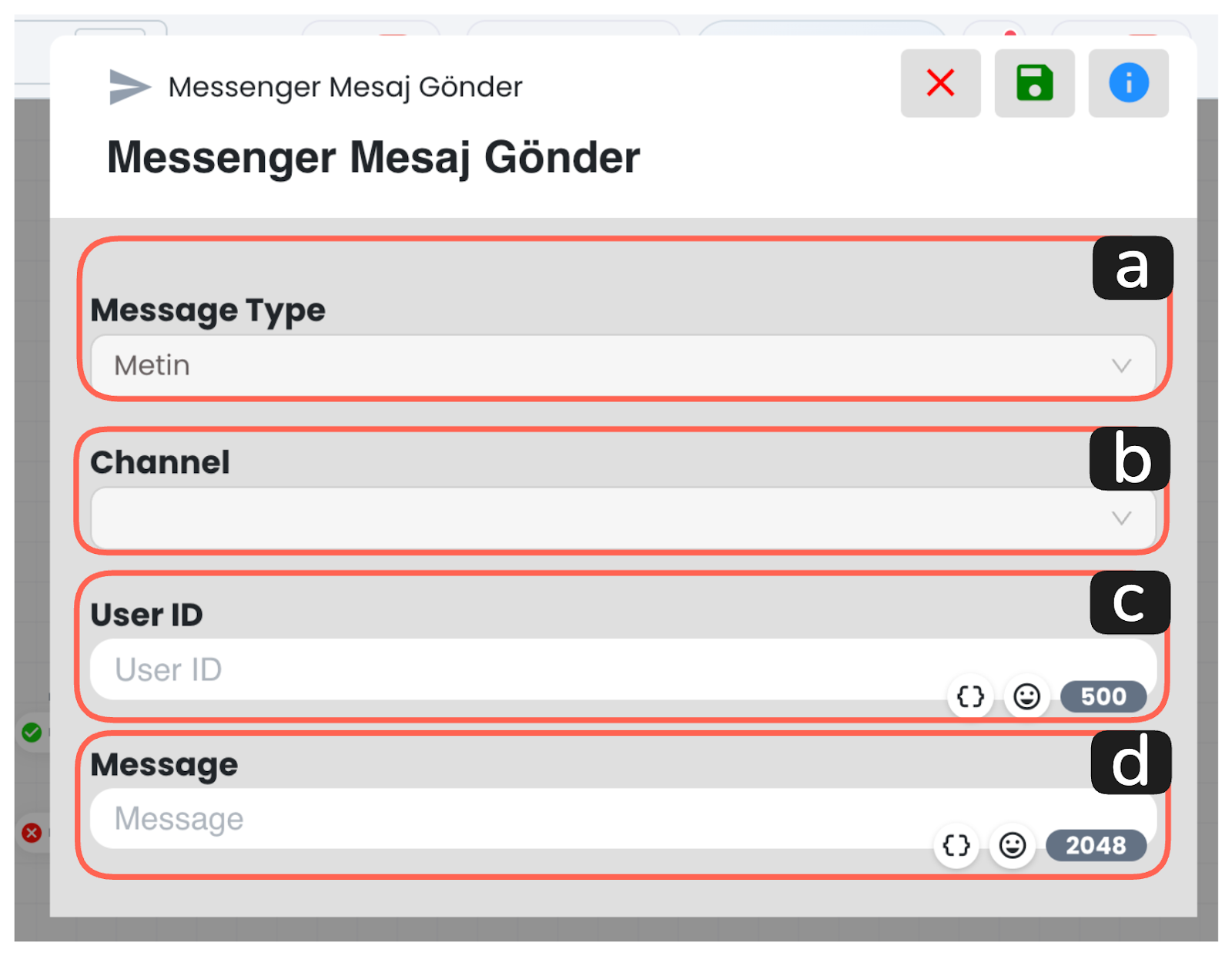 Bu alan, gönderilecek içeriğin türünü belirlemek için kullanılır. Gönderim formatını bu alandan belirleyerek mesaj içeriğini uygun yapıda hazırlayabilirsiniz. Metin ve resim mesaj tipleri desteklenmektedir.