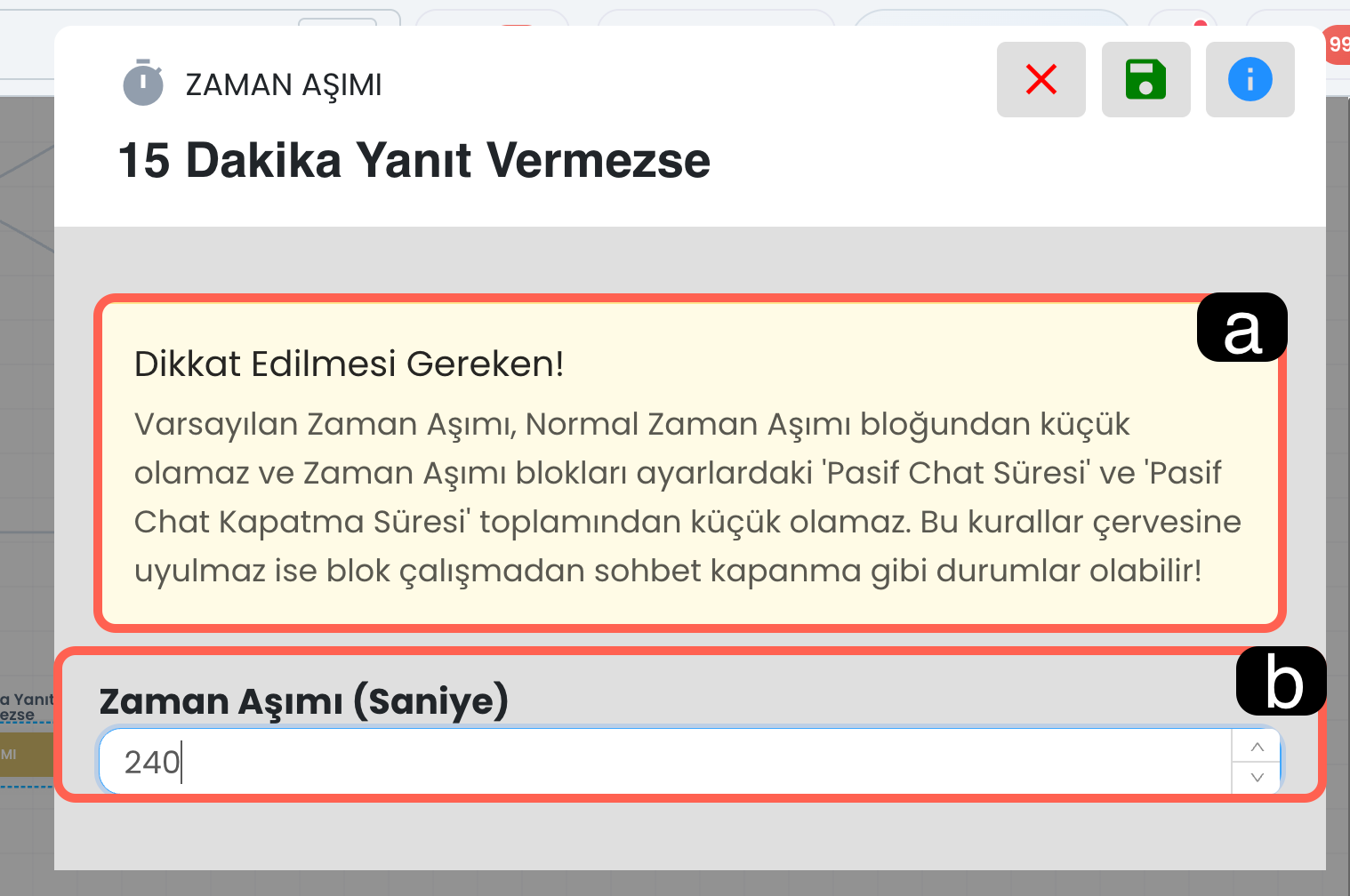 - Oturum Süresi: Zaman aşımı süresi, sistemde tanımlı oturum süresini aşamaz. Bu nedenle süre belirlerken yalnızca kullanıcı bekleme süresini değil, sohbet oturumunun toplam çalışma mantığını da dikkate almanız gerekir. Aksi halde zaman aşımı tetiklenemeden sohbetin kapanması gibi durumlarla karşılaşabilirsiniz. (bkz. Süre Ayarları)