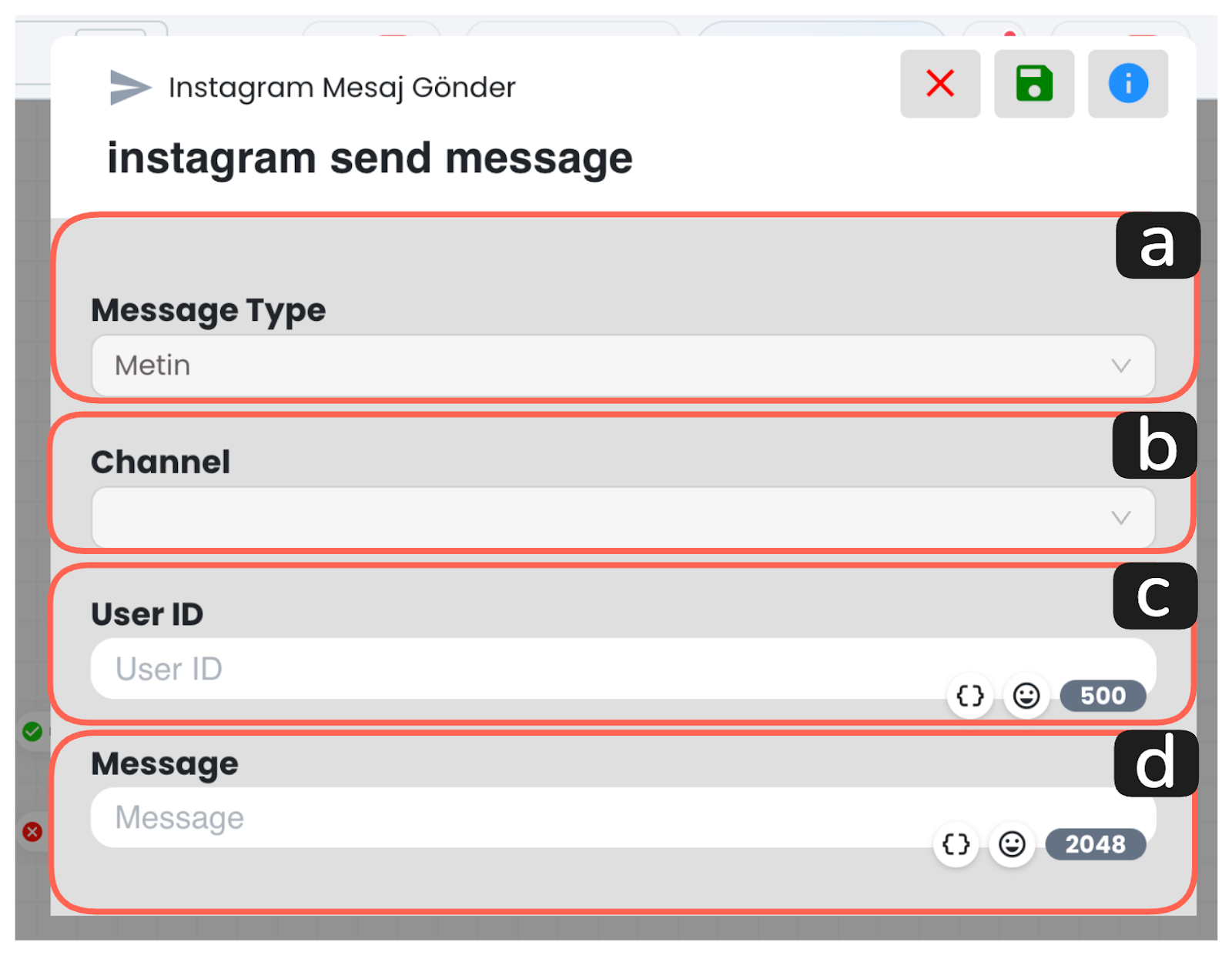Bu alana, mesajın gönderileceği kullanıcıyı Instagram platformu tarafında tanımlayan kullanıcı ID’si girilmelidir.