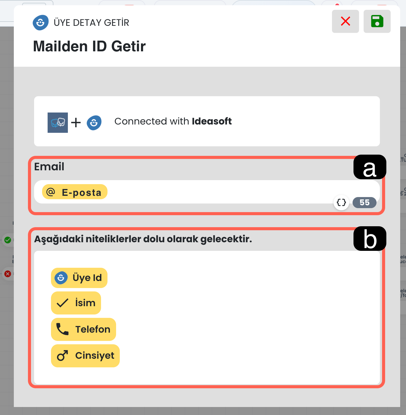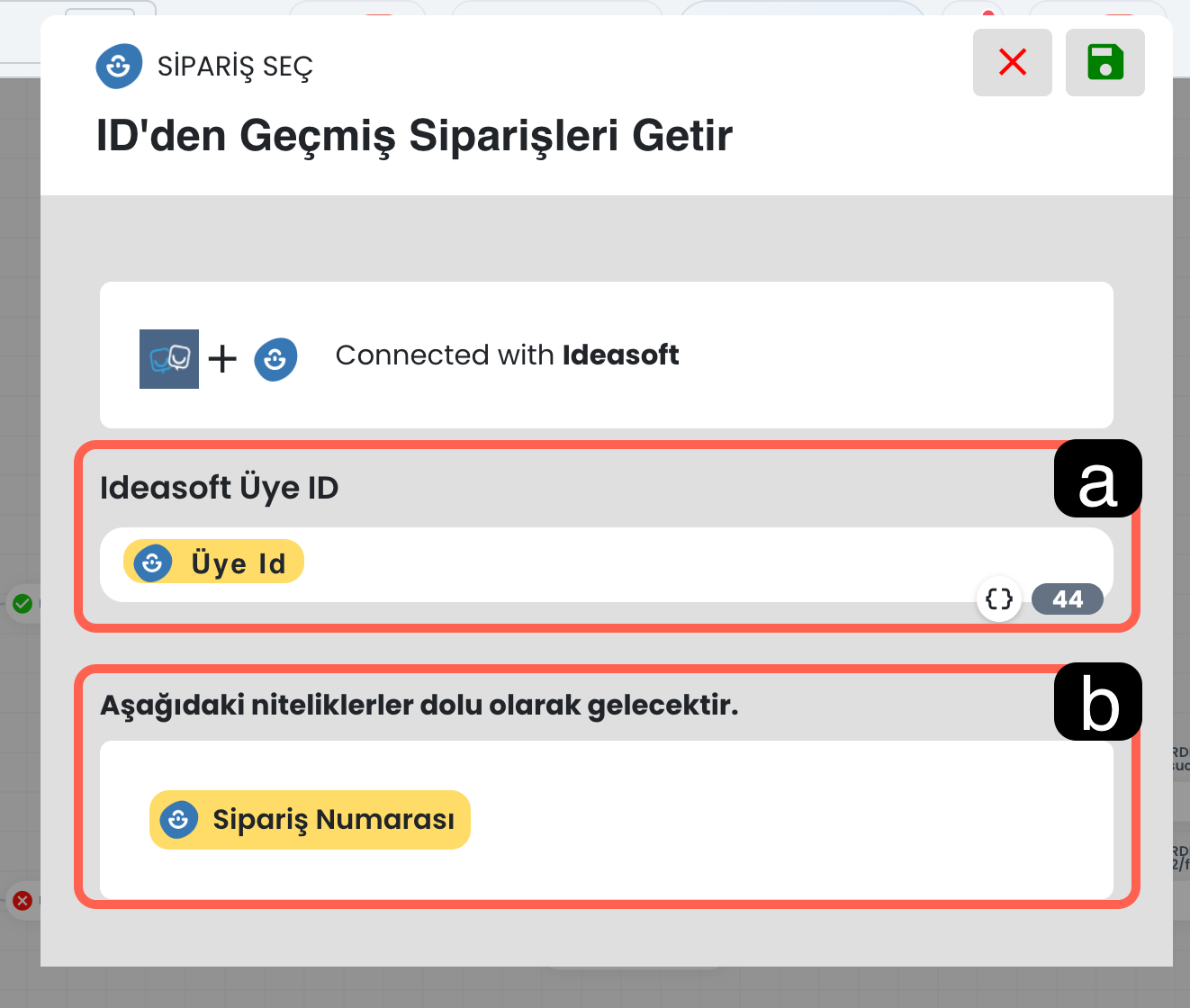Bu alana, Üye Detay Getir bloğundan dönen Ideasoft üye kimlik bilgisi girilir. Sistem, sipariş listesini bu üye ID’si üzerinden sorgular.