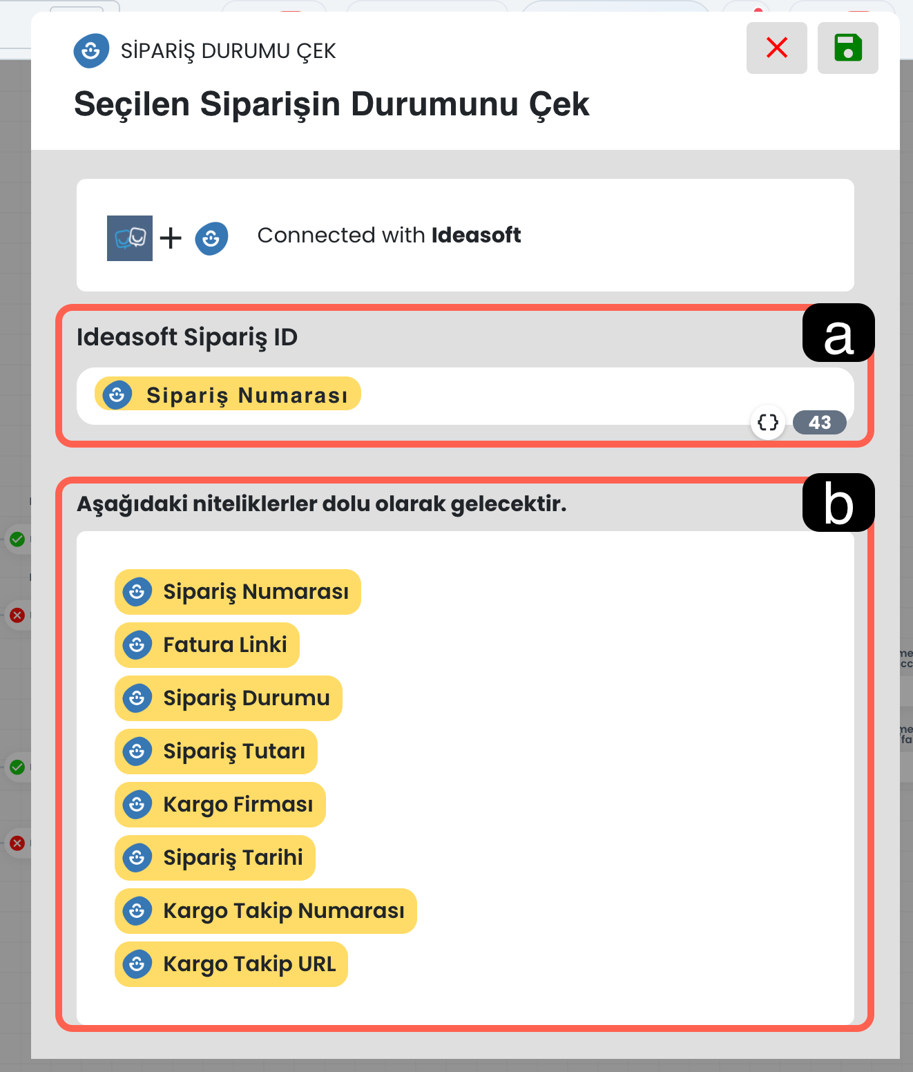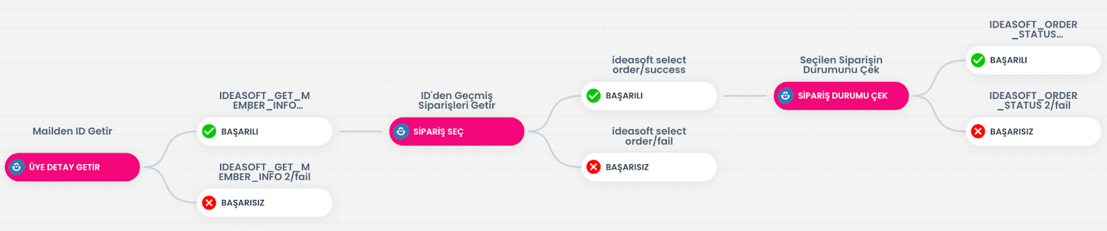 Ideasoft üzerinden sipariş sorgulama yapılabilmesi için blokların doğru sırayla yapılandırılması gerekir.