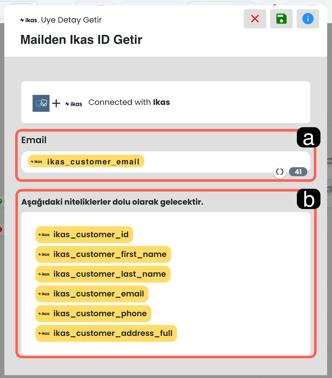 Bu blok, Ikas mağazasına kayıt olduğu müşteri e-posta adresi üzerinden diğer bilgilerini getirmek için kullanılır.