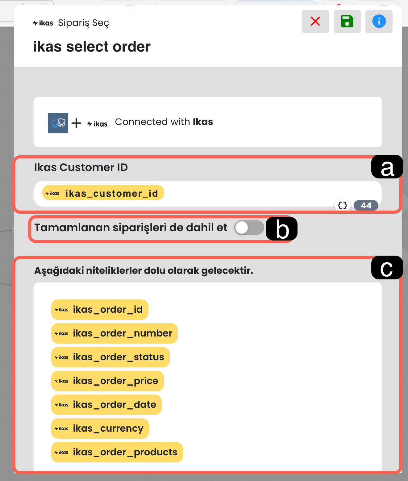 Bu alana, Üye Detay Getir bloğundan dönen ikas_customer_id bilgisi girilir. Sipariş listesi bu müşteri ID’si üzerinden getirilir.