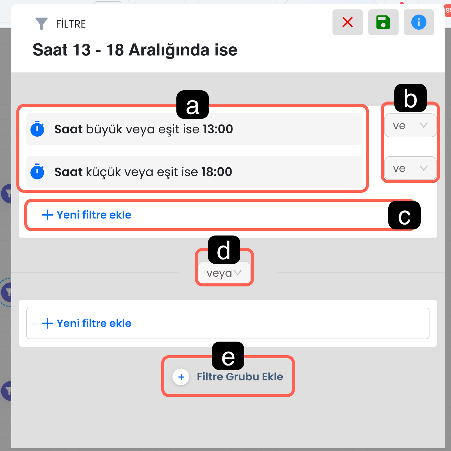 Bu alan, o filtre bloğu içinde tanımlanmış mevcut koşulları görüntülediğiniz bölümdür. Her satırda seçtiğiniz veri, karşılaştırma tipi ve hedef değer yer alır. Buradan mevcut filtreleri gözden geçirebilir, düzenleyebilir ve ihtiyaca göre güncelleyebilirsiniz. Örneğin “Saat büyük veya eşit ise 13:00” ya da “Saat küçük veya eşit ise 18:00” gibi kurallar bu bölümde listelenir.