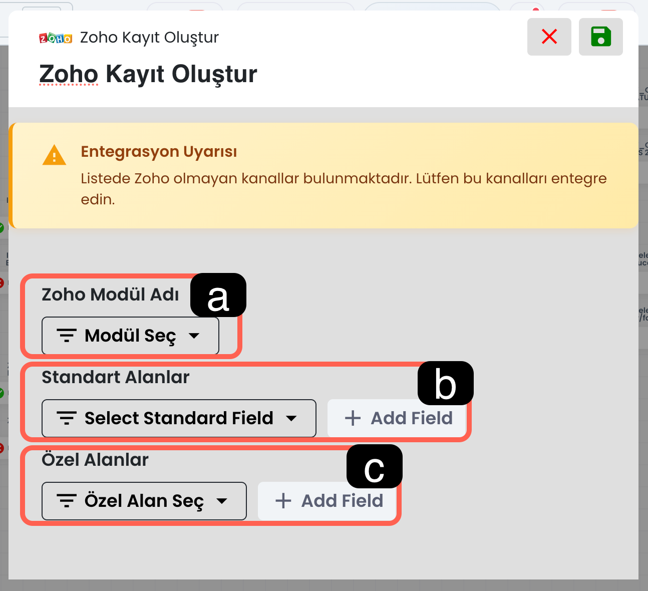 Bu alandan kayıt oluşturulacak Zoho modülü seçilir. Hangi modüle veri yazılacağı burada belirlenir.