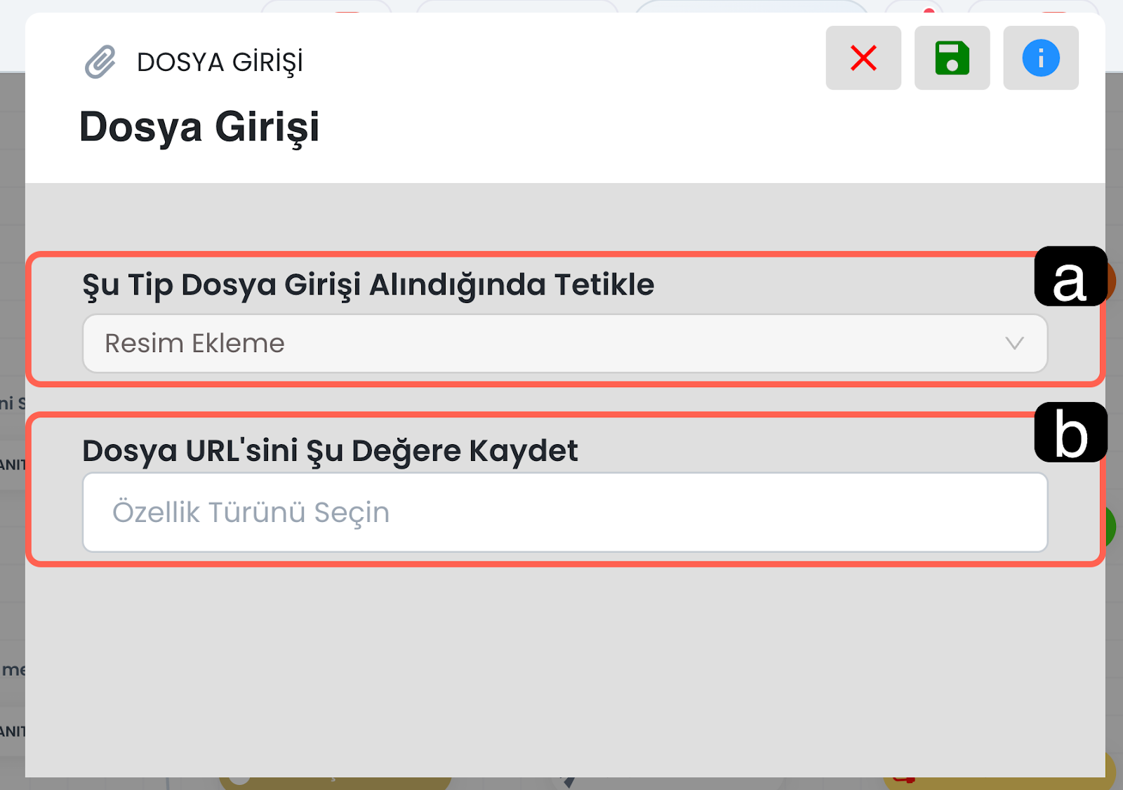 Yüklenen dosya sisteme alındığında dosyaya ait bir bağlantı oluşturulur. Bu alanı kullanarak oluşan dosya URL’sini seçtiğiniz değere kaydedebilir ve sonraki adımlarda tekrar kullanabilirsiniz. Özellikle dosyayı e-posta ile iletmek, temsilciye aktarmak veya başka bir işlemde referans olarak kullanmak istediğiniz senaryolarda bu alan oldukça faydalıdır
