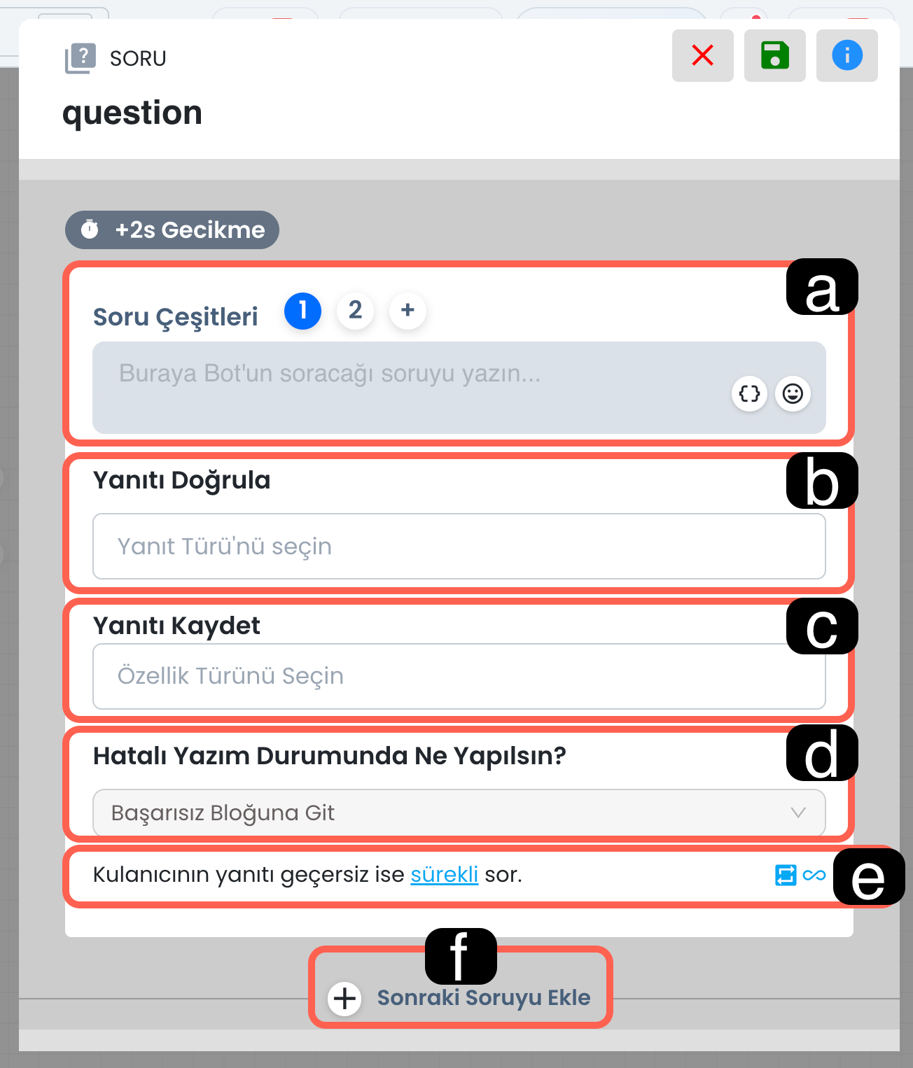 Bu alan, hazırladığınız yanıtın kullanıcıya ne kadar süre sonra gösterileceğini belirler. Gecikme süresi özellikle mesajların daha doğal görünmesi, kullanıcının önceki içeriği okuması için kısa bir bekleme bırakılması veya adım adım ilerleyen akışlarda botun daha kontrollü cevap vermesi için kullanılır. Kısacası bu ayar, botun yanıt hızını senaryonun tonuna uygun şekilde düzenlemenizi sağlar.
