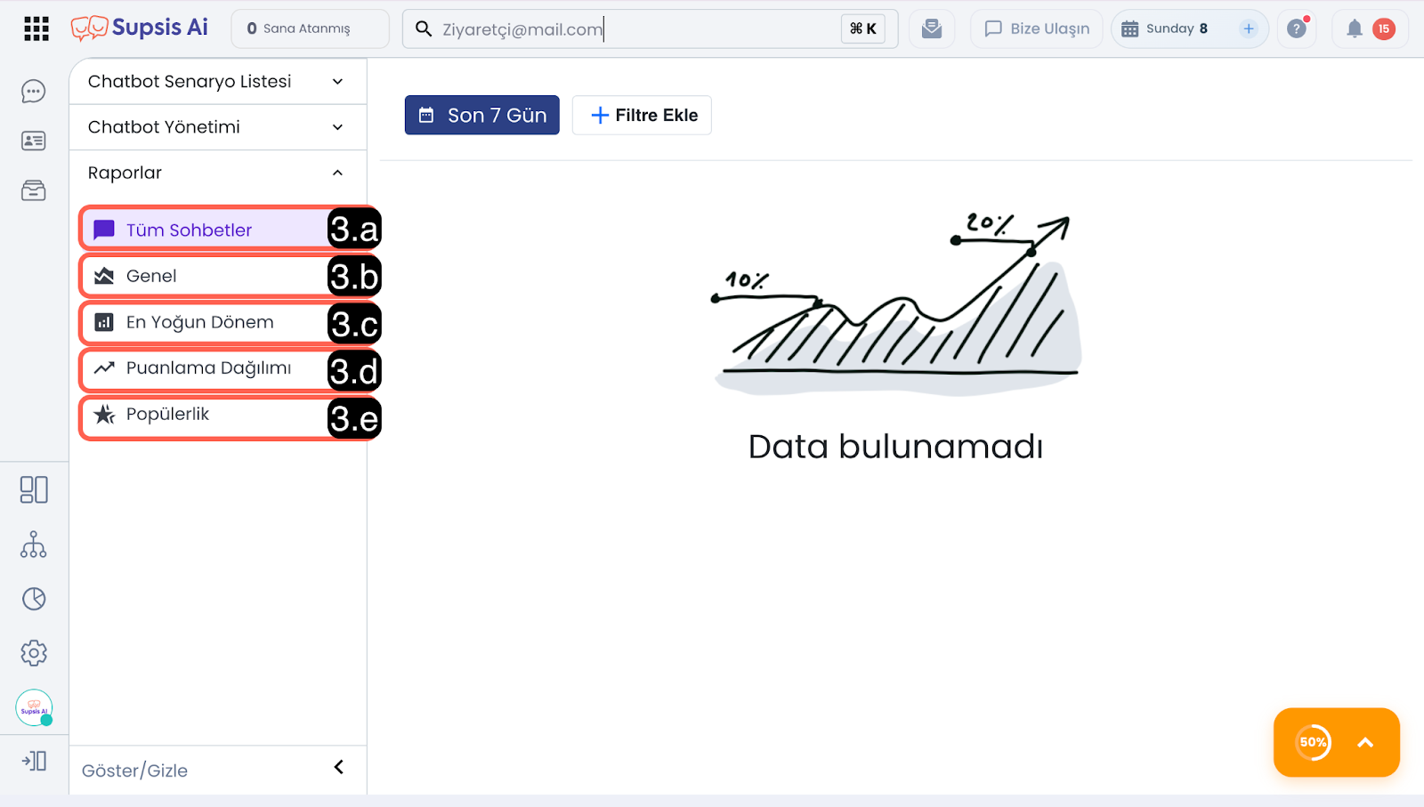 Raporlar bölümü, chatbot performansını gerçek zamanlı ve geçmişe dönük verilerle analiz etmenizi sağlar. Bu alan üzerinden kullanıcı etkileşimlerini, sohbet yoğunluklarını, memnuniyet seviyelerini ve bot içindeki davranış eğilimlerini takip ederek süreçlerinizi veriye dayalı biçimde iyileştirebilirsiniz. Hangi soruların daha sık geldiği, hangi yanıtların kullanıcıları tatmin ettiği ve hangi noktalarda iyileştirme gerektiği gibi kritik içgörüler bu bölümde görünür hale gelir.