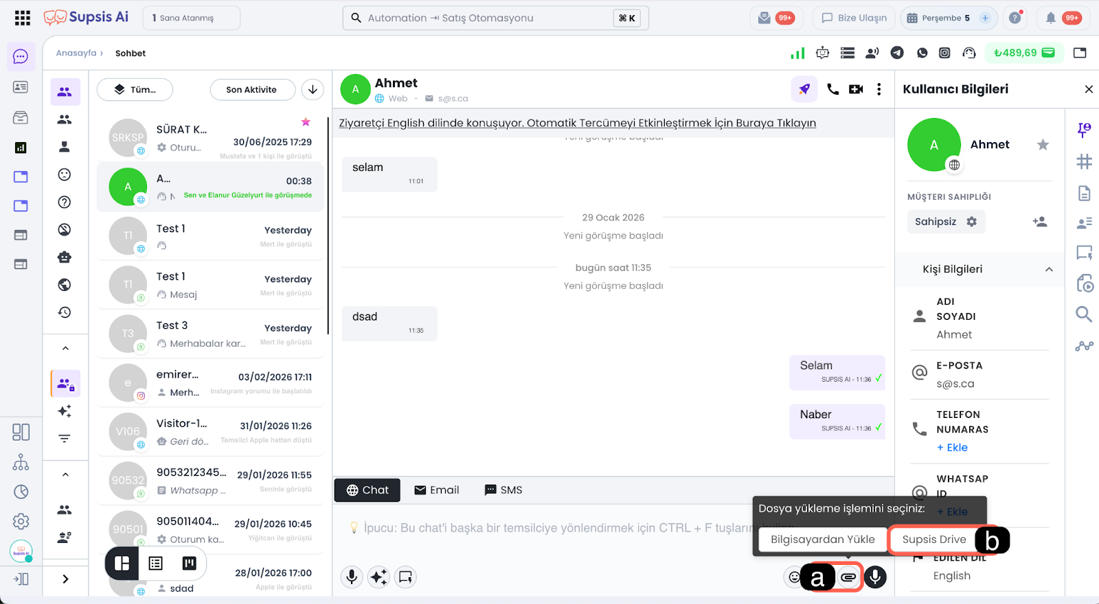Sohbet ekranı içerisinden dosya ekleme alanı kullanılarak Drive’daki içeriklere erişilebilir ve bu içeriklerin müşterilerle paylaşımı yapılabilir