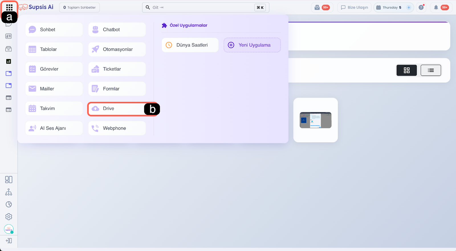 1.a – Drive Menüsüne Erişim Supsis Ai panelinde Modüller menüsü altında yer alan Drive seçeneği üzerinden Drive alanına erişim sağlanır.