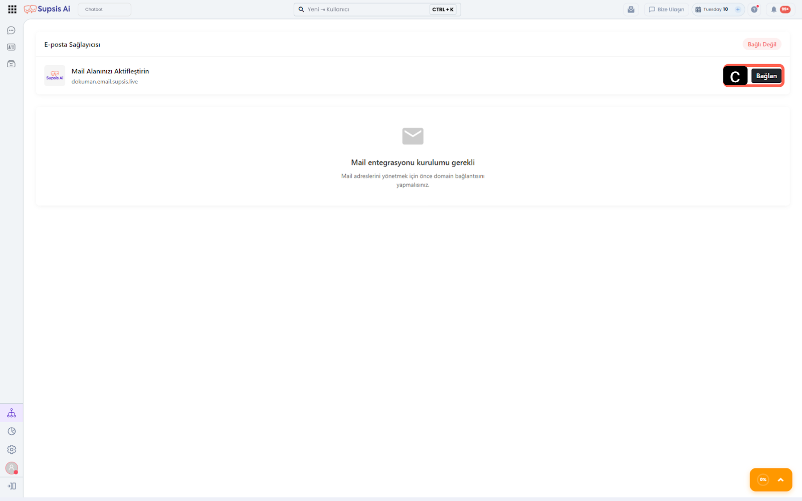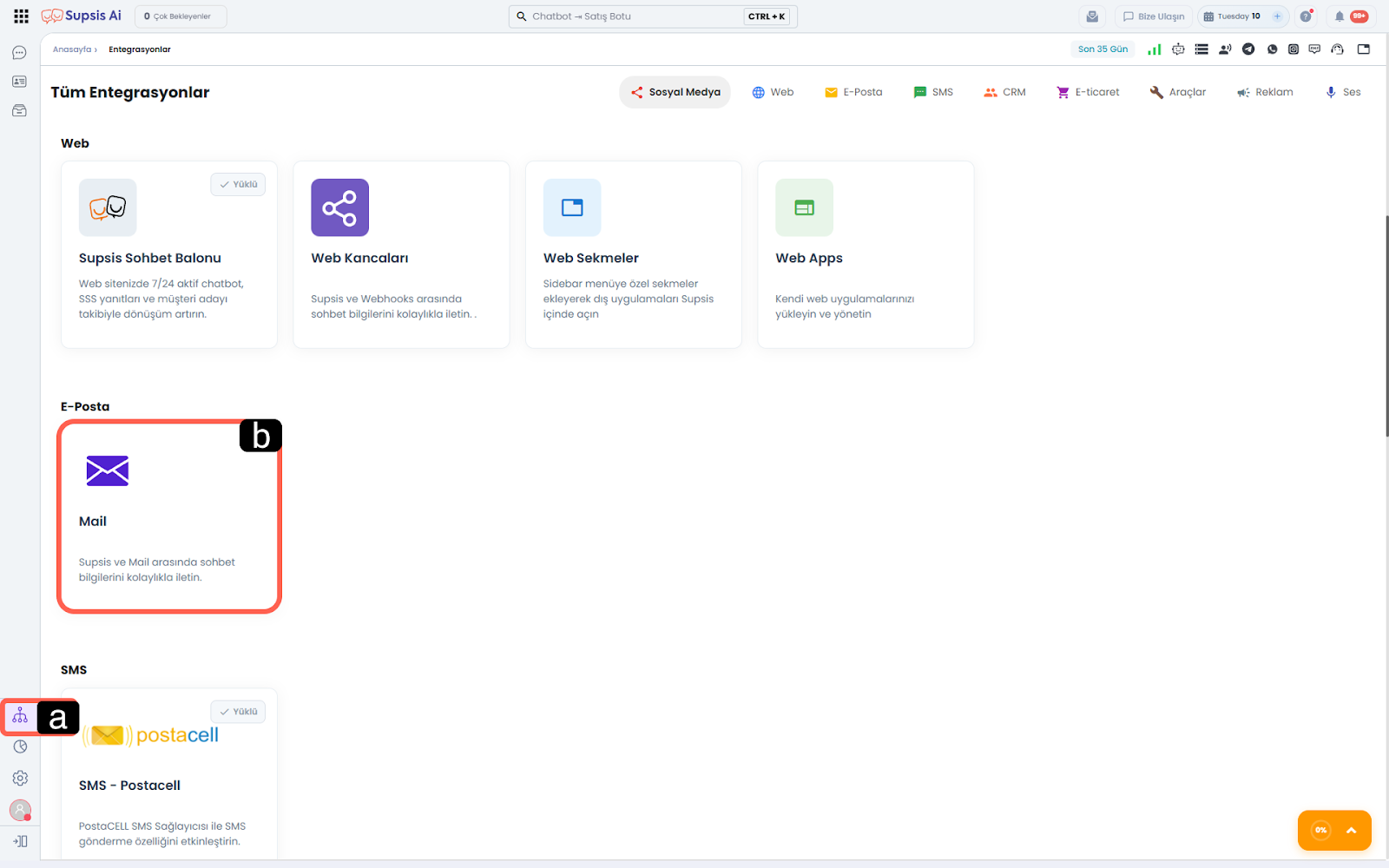 Supsis Ai panelinizin sol menüsünde yer alan Entegrasyonlar simgesine tıklayın. - b – Mail