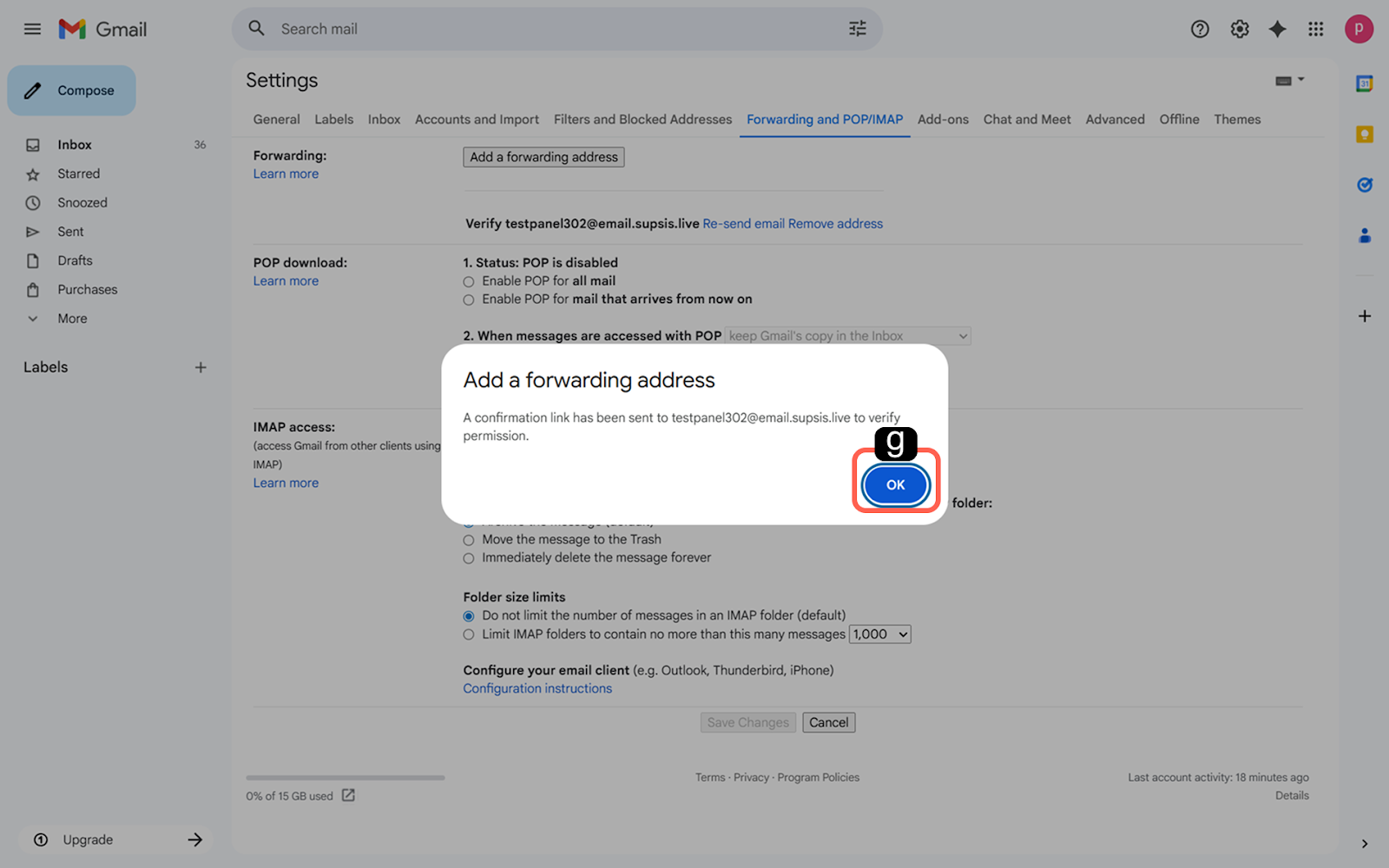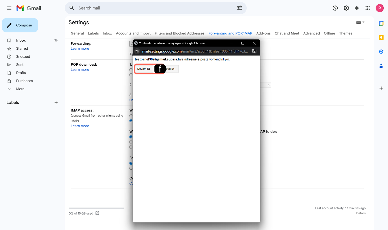 Gmail tarafından gösterilen onay kutusunda "Devam Et" seçeneğine tıklayarak yönlendirme isteğini başlatın.