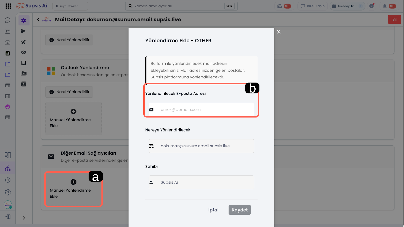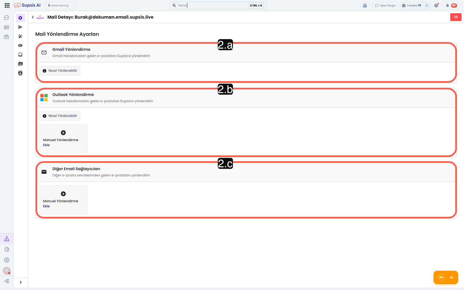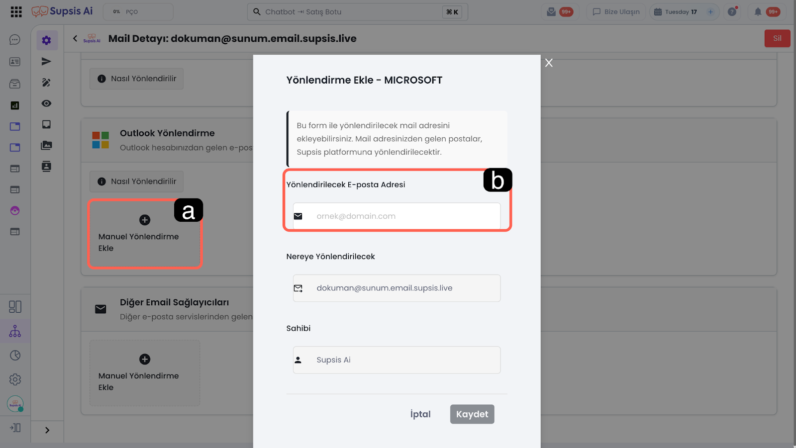 1.a – Supsis Ai Yönlendirme Maili Oluşturma