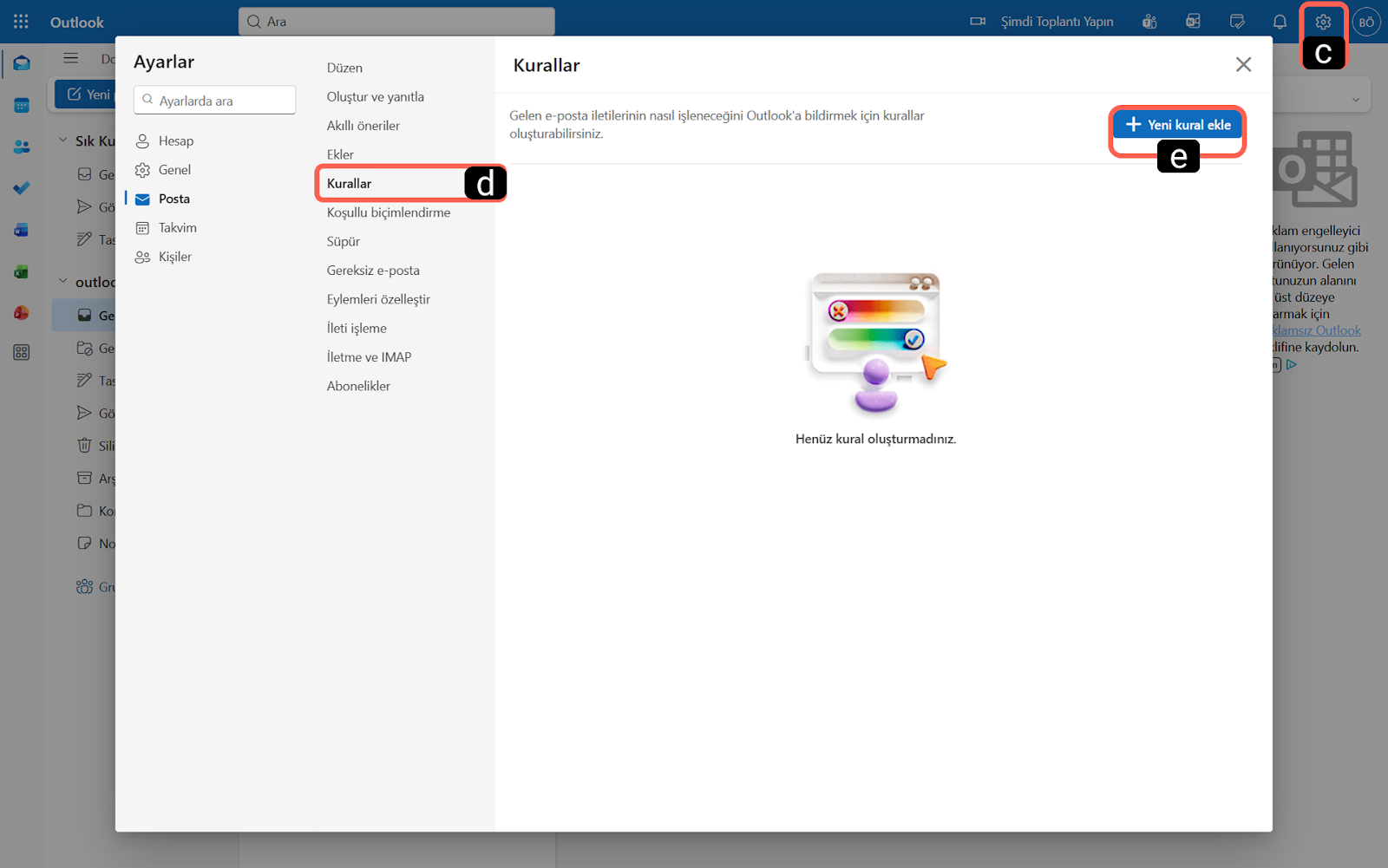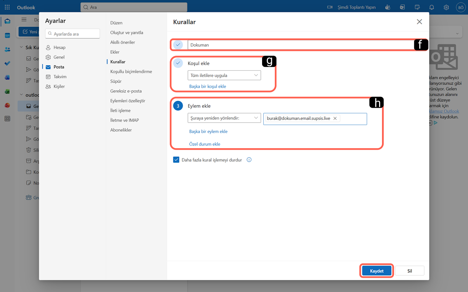 Supsis Ai panelinde hazırlığı yaptıktan sonra, Outlook web arayüzüne giderek asıl yönlendirme kuralını tanımlamanız gerekir: