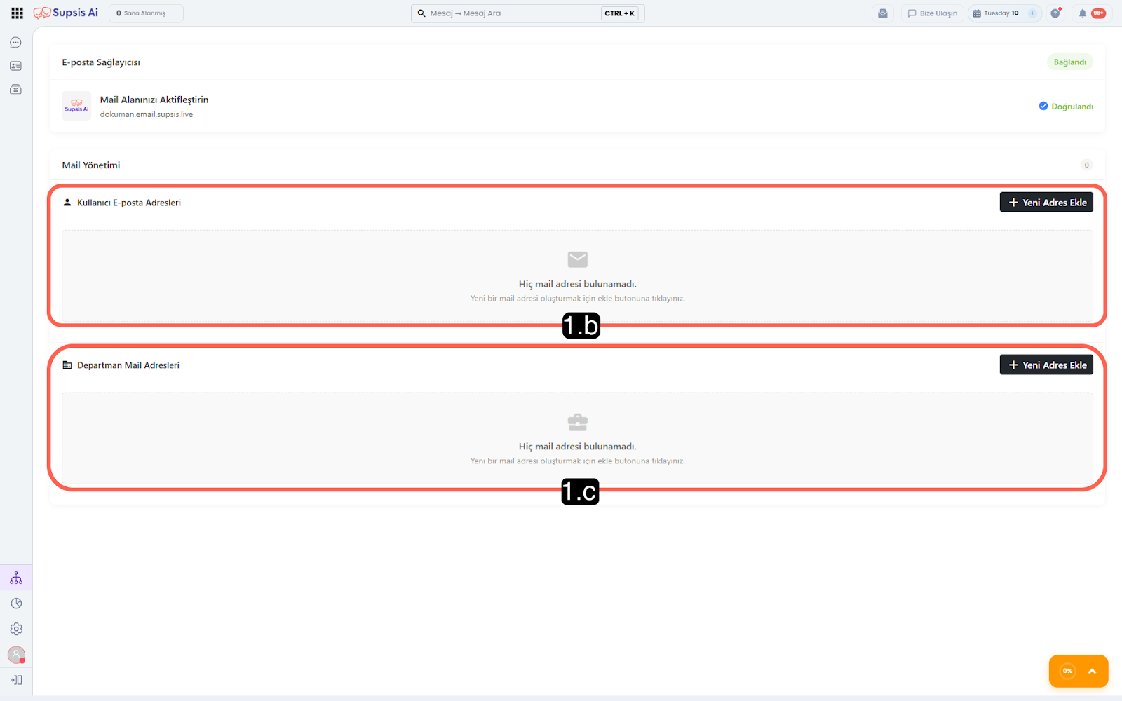 E-posta trafiğinizi panele aktarabilmek için öncelikle Supsis Ai domain bağlantılı bir mail oluşturmanız gerekir.