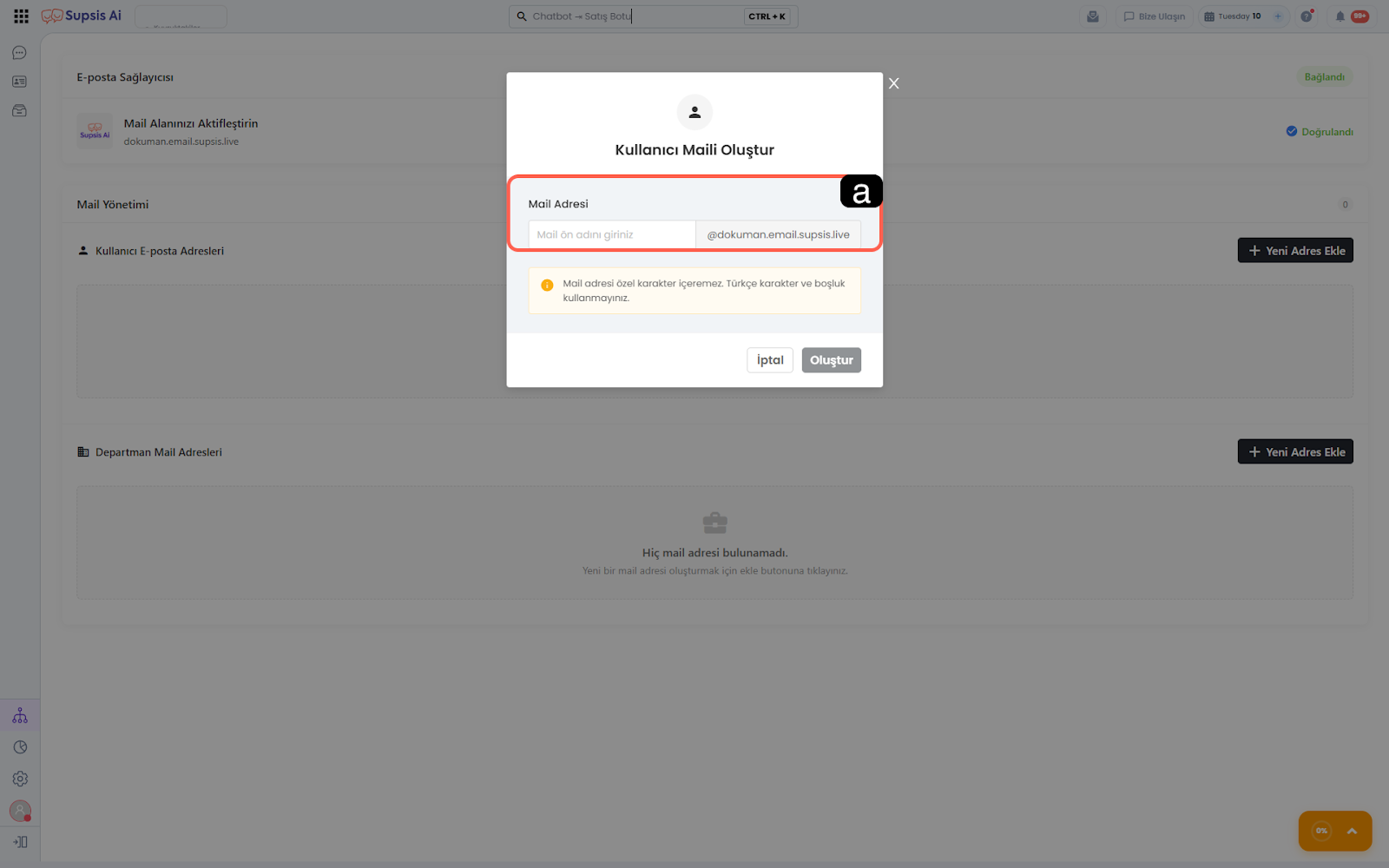 Açılan modalda kullanıcınıza özel olarak oluşturulacak mail ön adını girin.