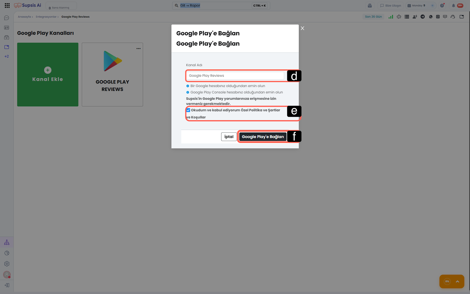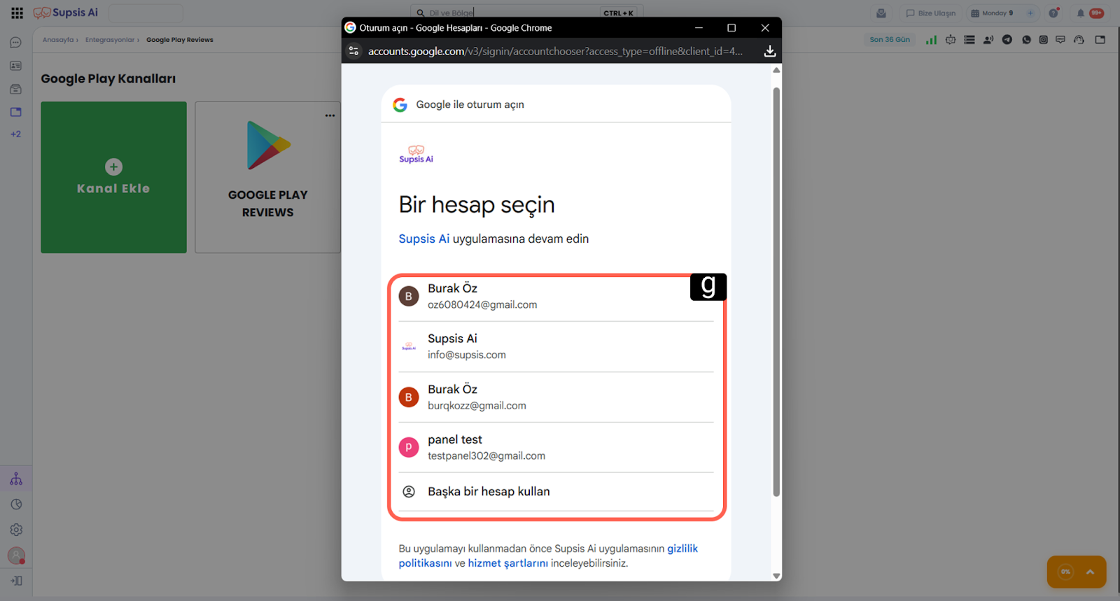 Google Play entegrasyon kanalı içerisindeki Kanal Ekle (artı ikonlu yeşil alan) butonuna tıklayın. Bu işlem, Google hesabınızı Supsis Ai’ye bağlamanız için yetkilendirme penceresine yönlendirecektir -